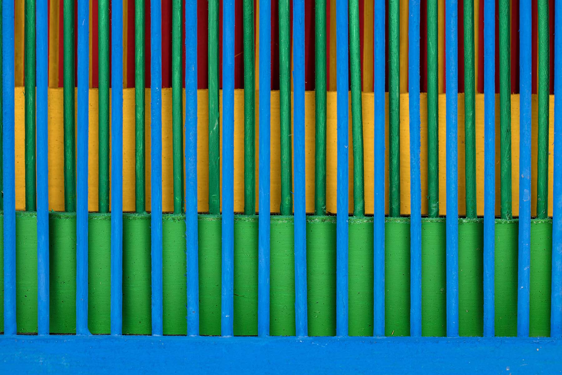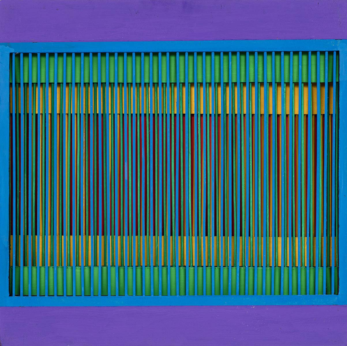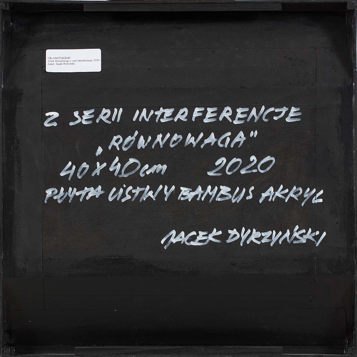 sygn. i opisany na odwrociu: Z SERII INTERFERENCJE / "RÓWNOWAGA" / 40 X 40 CM 2020 / PŁYTA LISTWY BAMBUS AKRYL / JACEK DYRZYŃSKI