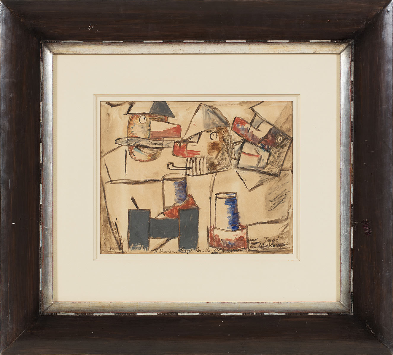 Oryginalność konwencji malarskiej Makowskiego polega na zespoleniu ze sobą rzeczy pozornie wyłączających się: geometrycznej, jakby kubistycznej stylizacji kształtu, przemieniającej postacie ludzkie w jakieś budowle, maszyny, kukiełki, i subtelnej ekspresji; obdarzaniu tych dziwnych budowli, maszyn, kukiełek spojrzeniami, ruchami, gestami mówiącymi nam o ich najbardziej intymnym życiu wewnętrznym. – Mieczysław Wallis (Jaworska W., Tadeusz Makowski. Życie i twórczość, wyd. Zakład Narodowy imienia Ossolińskich / Wydawnictwo Polskiej Akademii Nauk, Wrocław – Warszawa – Kraków 1964, s. 230) Około roku 1930 Tadeusz Makowski tworzy serię prac, których bohaterami są dorośli. Zasadniczą charakterystyką portretowanych postaci jest ich deformacja. Stosowany przez artystę zabieg uproszczenia twarzy dający efekt maski posunięty jest tu znacznie dalej. Trzy męskie postaci z oferowanej kompozycji „Pijący” ujęte są w kształcie niemalże kamiennych bloków. Grubo ciosane dłonie, masywne sylwetki – należą do ludzi wykonujących na co dzień ciężką fizyczną pracę. Kubistyczne, surowe potraktowanie postaci kontrastuje jedynie uśmiech na ich twarzach, zdradzający moment odpoczynku przy szklance wina. Makowski zdaje się mówić, że te masywne bloki mają duszę i emocje, nie pozbawione są też pewnego poczucia humoru. „Ażeby jednak wyrazić trud człowieka, artysta nie przedstawia go przy pracy, lecz podczas wypoczynku – i na tym polega ominięcie psychologicznego szablonu” – pisze Władysława Jaworska w monografii Tadeusza Makowskiego (Jaworska W., Tadeusz Makowski. Życie i twórczość, wyd. Zakład Narodowy imienia Ossolińskich / Wydawnictwo Polskiej Akademii Nauk, Wrocław – Warszawa – Kraków 1964, s. 260). Makowski niewątpliwie inaczej traktuje przedstawienia osób dorosłych niż dzieci. Są oni ostrzejsi i brutalniejsi w wyrazie, bardziej dosadni. Świat dorosłych to rzeczywistość z bretońskich wiejskich oberży. Roześmianych rubasznych mężczyzn z oferowanej akwareli odnajdujemy w obrazie olejnym „Les Buveurs”. Obraz ten, cytując Jaworską: „wzbudzał powszechną sensację w Salon de l’Art Independant Francais w Paryżu swą niezwykłą formą i autentycznym folklorem bretońskim” (Tamże, s. 260). Po motyw pijących przy stole chłopów Makowski sięgał często na początku lat 30. Znana jest seria rysunków, akwarel i grafik podejmujących tę tematykę. Oferowana praca została przez Tadeusza Makowskiego zadedykowana jego przyjacielowi, francuskiemu krytykowi sztuki, Rogerowi Briellowi.