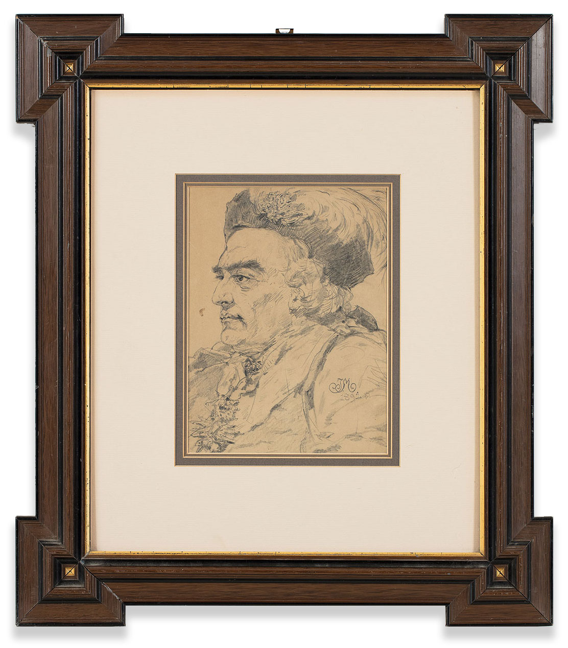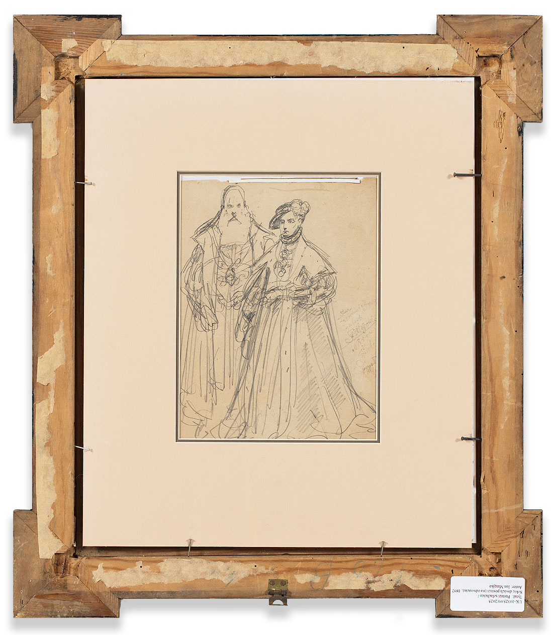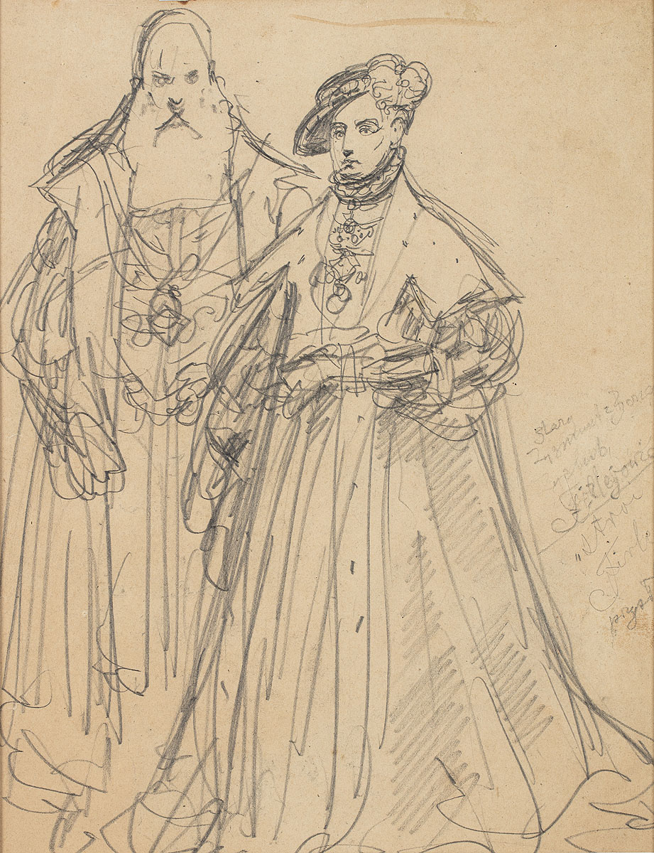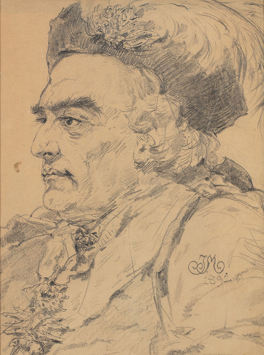 sygn. p.d. monogramem: JM / 1892, na odwrociu kompozycja „Zygmunt Stary z Boną”, opisana p.śr.: Stary / Zygmunt z Boną / Zygmunt / Firlejowie / „Stroi / Firleje” / przysłowie, opisana l.d.: Czasy Zygm. I go Starego