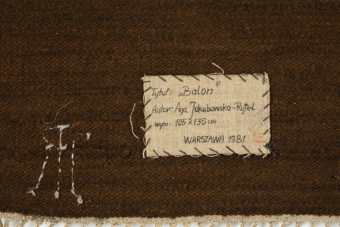 sygn. p.d.: JR [monogram], sygn. i opisany na naszywce z tyłu: Tytuł: "Balon" / Autor: Aga Jakubowska-Rytel / wym. 105 x 136 cm/ WARSZAWA 1981