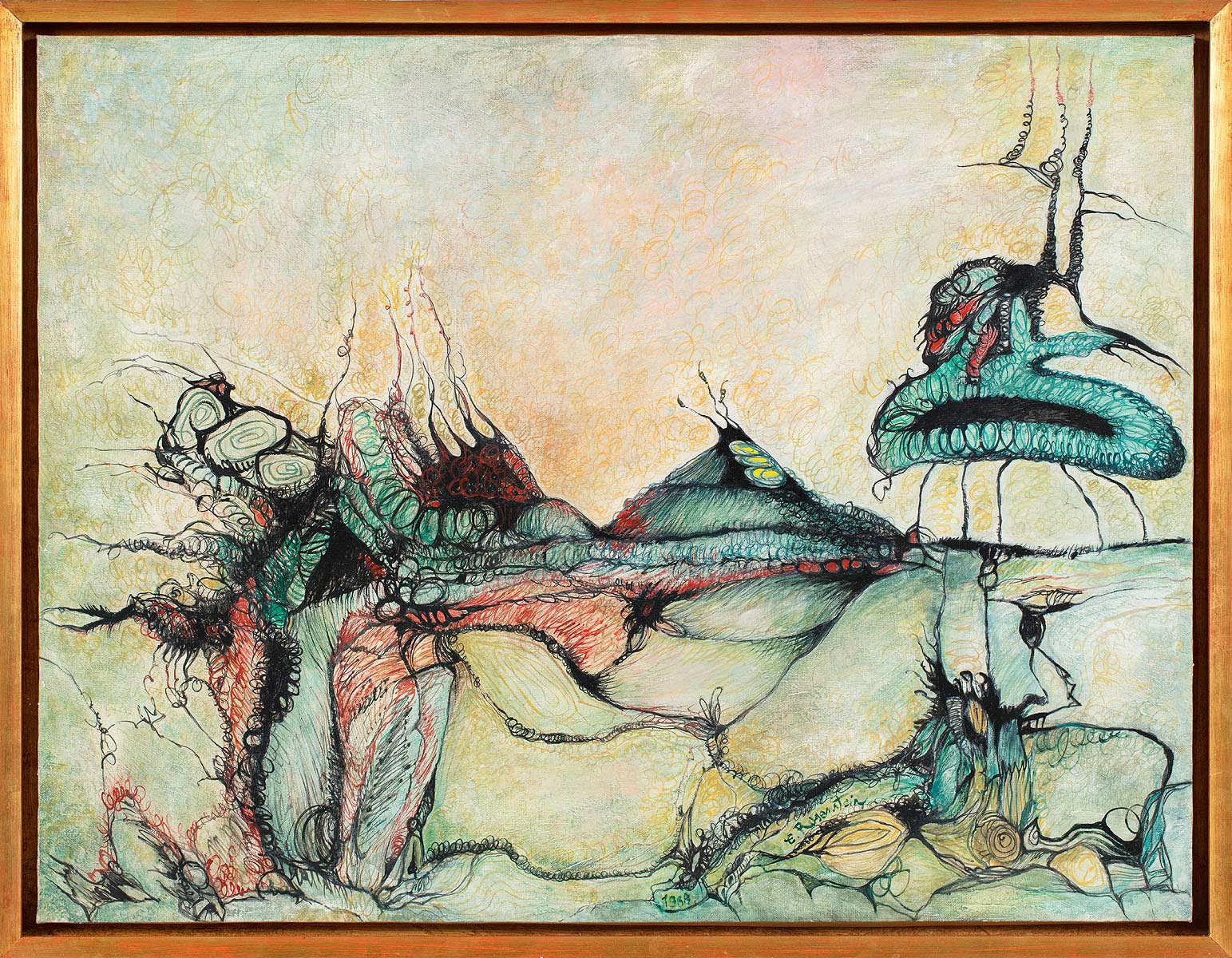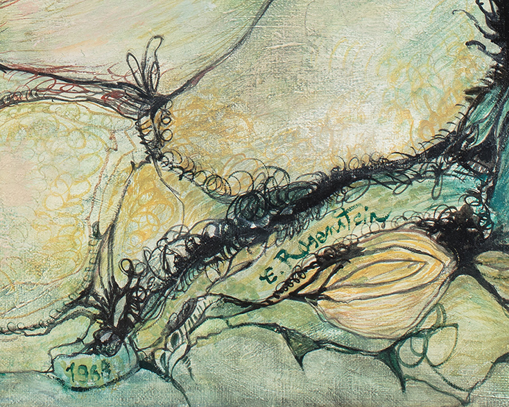 sygn. w kompozycji: 1968 E. Rosenstein, sygn. i opisany na odwrociu: E. Rosenstein / "BAŚŃ O RYCERZU" / olejny, tempera / 72 x 100 cm / 1968