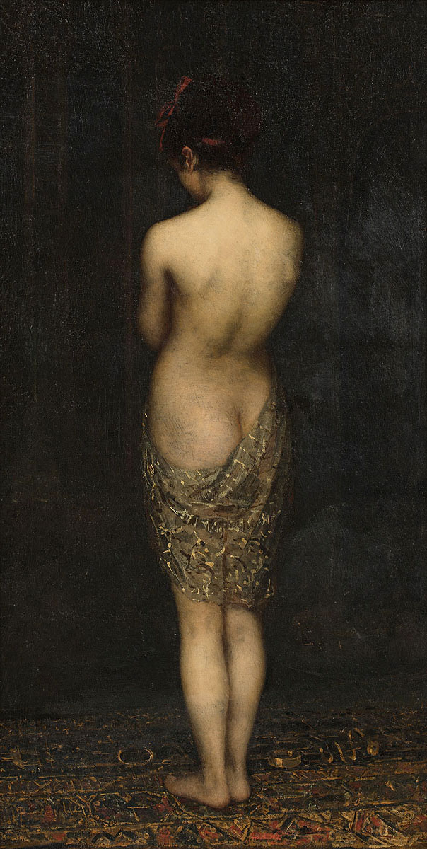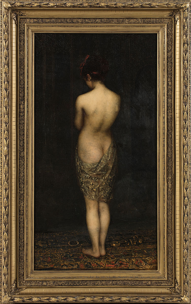 Prezentowany obraz jest autorską repliką znacznie większego dzieła zatytułowanego „Dziewczyna w kąpieli”, znajdującego się w zbiorach Muzeum Narodowego w Krakowie, zakupionego bezpośrednio od artysty. Kompozycja wpisuje się w cykl orientalnych aktów Szyndlera – takich jak „Hurysa”, „Odaliska”, „Turczynka” czy „Niewolnica” – ukazujących idealizowane piękności Wschodu w intymnych, zmysłowych scenach. Na tle ciemnego wnętrza łaźni artysta przedstawił nagą, młodą kobietę odwróconą tyłem, stojącą na bogato zdobionym kobiercu. Delikatnie pochylona, przytrzymuje rękami złocisty, półprzezroczysty szal, który spływa miękko po jej biodrach i udach. Włosy dziewczyny, zaczesane do góry i związane czerwoną wstążką, podkreślają smukłość szyi i finezyjny rysunek pleców. Jej jasna, niemal alabastrowa karnacja kontrastuje z ciemnym tłem i migotliwym połyskiem złotego materiału. W tle ledwie majaczy arkadowa wnęka – po lewej stronie z tryskającą fontanną, po prawej z metalową misą kąpielową. Na dywanie, u stóp dziewczyny, artysta umieścił porzucone bransolety – znak kobiecej próżności, ale też symbol utraconej niewinności. Krytycy zachwycali się kompozycją pisząc, że Szyndler „namalował prześlicznie obnażoną postać dziewczęcia. Zdaje się krwią na płótnie pulsować to miękkie, białe, młodziutkie ciało, tylko trochę okryte przejrzystą gazą jedwabną. P. Szyndler rozwinął tu niezwykły powab i miękkość udatnie” (M. K., Malarstwo polskie, „Prawda”, 3, 1883, nr 4, s. 44). Oferowana praca Szyndlera należy do serii kilku mniejszych wariantów o zbliżonej tematyce i kompozycji. W jednym z nich młoda kobieta pojawia się w towarzystwie władcy haremu i eunucha (Dramat w seraju), w innym – z pojedynczym mężczyzną (Kobieta w kąpieli), a w trzecim – w scenerii z tryskającą fontanną (Dziewica w kąpieli). W każdym z tych ujęć artysta łączy akademicką perfekcję warsztatu z egzotyczną zmysłowością, typową dla malarstwa orientalistycznego drugiej połowy XIX wieku. Prezentowany kameralny, subtelny wariant „Dziewczyny w kąpieli” zachwyca wyważonym erotyzmem i doskonałym malarskim opracowaniem aktu. Szyndler – wierny tradycji akademickiej, a zarazem wrażliwy na atmosferę i światło – osiąga tu mistrzowski efekt klasy i elegancji, czyniąc z tego przedstawienia jedno z najbardziej wyrafinowanych studiów kobiecego ciała w jego dorobku.