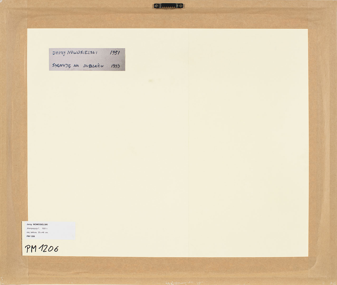 na odwrociu nalepka z opisem pracy oraz nalepka z reprodukcją sygnatury: JERZY NOWOSIELSKI 1951 / SYGNUJĘ NA DUBLAŻU 1993