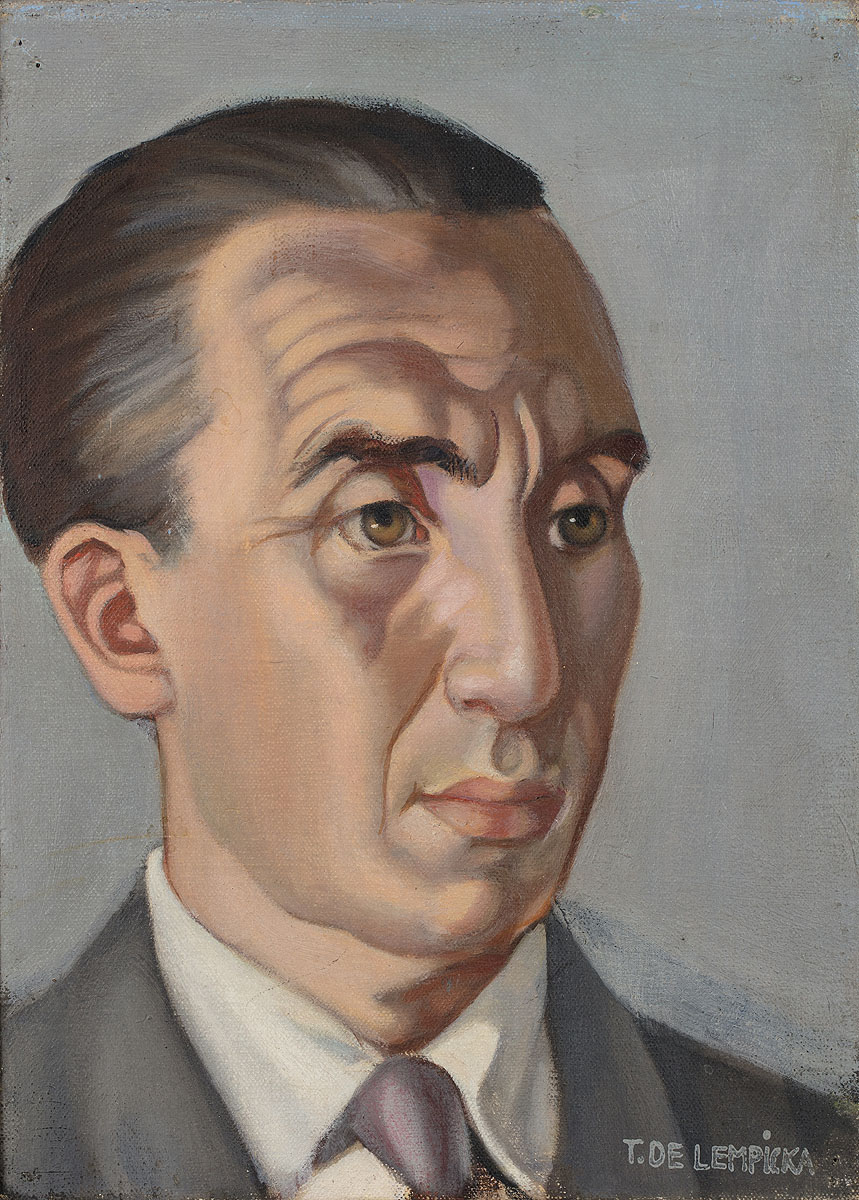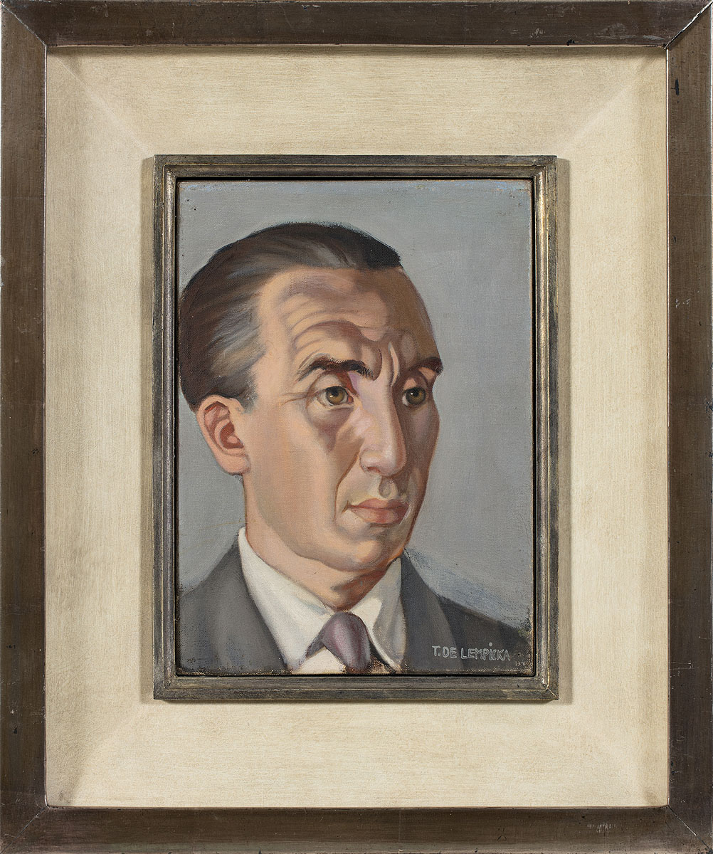 Gino Puglisi był z pozoru skromnym, ale utalentowanym włoskim architektem, a także wytrawnym kolekcjonerem i miłośnikiem sztuki, zwłaszcza tej tworzonej przez kobiety. Wśród jego zbiorów znajdowały się obrazy takich artystek jak Marie Laurencin i Mariette Lydis, jednak szczególne miejsce zajmowały dzieła Tamary Łempickiej — przez lata zgromadził aż dwadzieścia jej prac. Pierwszy obraz zakupił od niej w 1933 roku, a już rok później zamówił swój własny portret. W sumie artystka portretowała go aż cztery razy – więcej niż jakiegokolwiek innego mężczyznę. Z Puglisim połączyła ją bliska, choć nie do końca jasna relacja. Byli przyjaciółmi przez całe jej życie, a wedle córki artystki, Kizette, ostatecznie zostali kochankami. Zachowała się obszerna korespondencja między nimi, w której malarka otwarcie zwierzała się ze swoich rozterek emocjonalnych, co stanowiło wyjątkową rzadkość – zwykle, nawet wobec najbliższych, była oszczędna w wyrażaniu uczuć. „Nie mogę pracować ani czytać, moja depresja jest zbyt wielka. Głowa już mi nie pracuje. To też ten klimat, brak słońca. (…) Chciałabym któregoś dnia zostawić to wszystko i wyjechać do Włoch! Jestem pewna, że poczułabym się lepiej. (…) Proszę się nie gniewać, że piszę tak mało, ale często o panu myślę, a wszystko, co jest we mnie dobrego, może pan odnaleźć w moich obrazach z pańskiej kolekcji.” – pisała Łempicka do Puglisiego z Valmont w 1935 roku (List z dn. 18 stycznia 1935, cyt. za: Claridge L, Tamara Łempicka. Między art deco a dekadencją, Dom Wydawniczy REBIS, Poznań 2009, s. 235). Z korespondencji przebija porozumienie i bliskość, które przez dekady budowały specyficzną więź artystki z kolekcjonerem. Prezentowany portret Gina Puglisiego, powstały około 1953 roku, jest jego przedostatnim wizerunkiem namalowanym przez Łempicką. Powstał w okresie, kiedy malarką bardziej interesowała się prasa włoska, niż francuska czy amerykańska, sprzyjając jej stylowi życia i licznym romansom, niezależnie od dojrzałego wieku. „Tego roku w Rzymie Łempicka namalowała trzeci, bardzo dobry portret Gina Puglisiego. Starała się nie dopuścić do spotkania męża i przyjaciela, co dowodziłoby, że była wówczas kochanką Włocha. Jak twierdzi Alain Blondel, Łempicka wysłała do Gina telegram, w którym odwołała ich zaplanowane spotkanie w Rzymie: w Wiedniu niespodziewanie pojawił się mąż.” – podaje autorka biografii artystki (Claridge L., dz. cyt., s. 342). Oferowany wizerunek niewielkiego formatu przedstawia wszelkie cechy wytrawnego stylu Łempickiej. Twarz mężczyzny jest precyzyjnie wyrysowana, lekko zgeometryzowana i uproszczona. Mocny modelunek światła i cienia podkreśla szlachetność jego rysów. Chłodna gama błękitów i szarości, wykorzystana w partii ubrania, włosów i tła, kontrastuje z ciepłymi tonami skóry. Tymczasem zmarszczone czoło, wyraziste brwi i skupione spojrzenie – nadają modelowi niemal posągową siłę oraz powagę. Portret Puglisiego to nie tylko podobizna, lecz także skryty, intymny wyraz emocjonalnej dynamiki łączącej go z artystką – relacji, która pozostanie dalej tajemnicą.