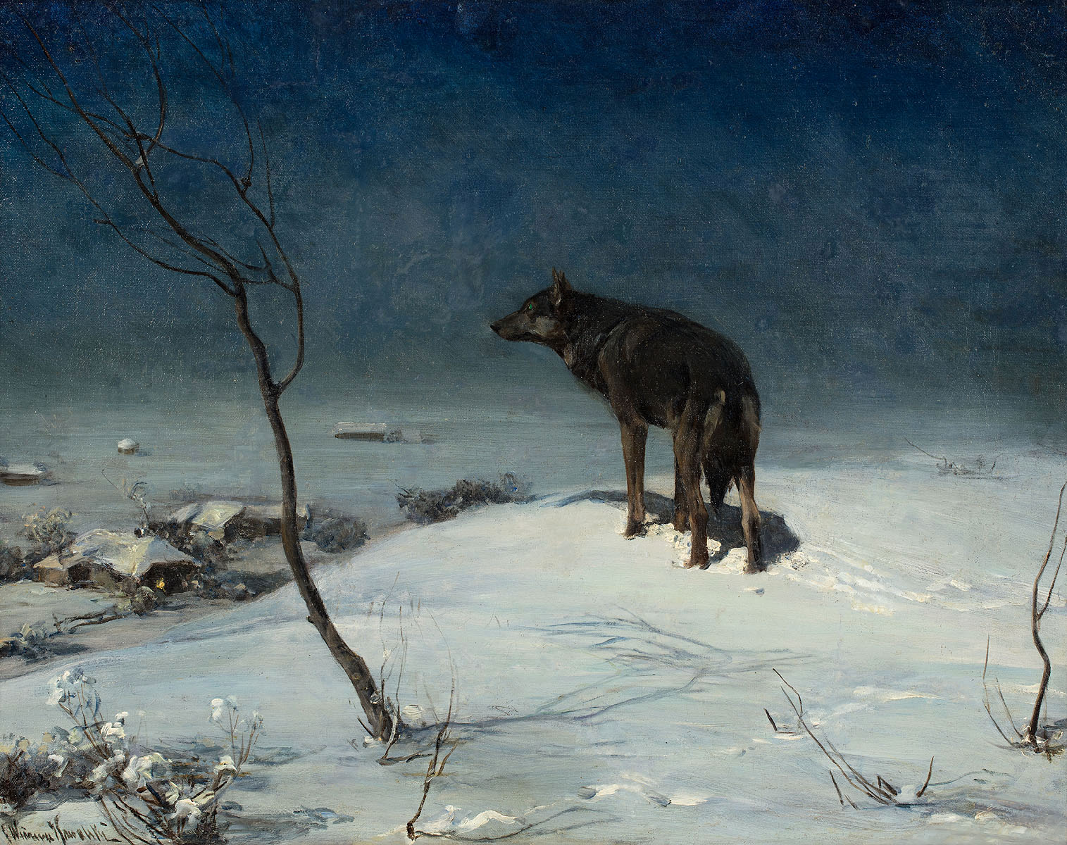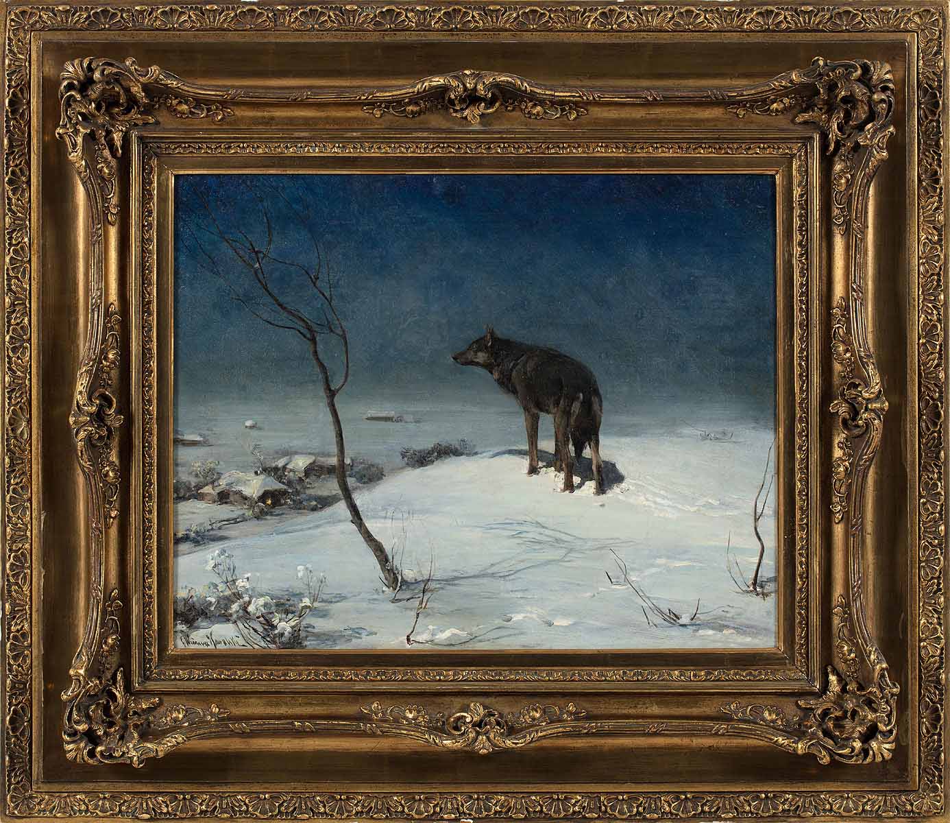 Jednym z najlepiej rozpoznawalnych motywów w twórczości Alfreda Wierusza-Kowalskiego są jego słynne sceny z wilkami – pełne napięcia, dramatyzmu i nastrojowego chłodu zimowych krajobrazów. Artysta sięgnął po ten temat już w latach 80. XIX wieku, w okresie rosnącej popularności i uznania, jakie zdobywał zarówno w Polsce, jak i za granicą. Dużą rolę w upowszechnieniu jego malarstwa odegrała współpraca z ilustrowanymi czasopismami, takimi jak „Kłosy”, „Tygodnik Ilustrowany”, „Tygodnik Powszechny” czy „Biesiada Literacka”. To właśnie na łamach „Kłosów” w styczniu 1880 roku po raz pierwszy opublikowano drzeworytniczą reprodukcję obrazu „Napad wilków” – kompozycji, która zapoczątkowała całą serię przedstawień z tym motywem i ugruntowała reputację artysty jako „malarza wilków”. Wierusz-Kowalski malował zarówno dramatyczne sceny ataków wilków na podróżnych, jak i liryczne, pełne melancholii nokturny z samotnym zwierzęciem przemierzającym zimowy krajobraz. Motyw ten miał dla artysty wymiar osobisty – jego źródłem była dziecięca trauma. W wieku ośmiu lat, podczas podróży z rodziną, młody Wierusz-Kowalski doświadczył ataku wilków. Wydarzenie to głęboko zapisało się w jego pamięci i powracało w jego sztuce niczym próba oswojenia lęku. Artysta z niezwykłą dokładnością studiował anatomię i ruch zwierząt – zarówno w naturze, jak i z modeli. W rodzinnym majątku w Mikorzynie hodował sześć żywych wilków, a w swojej monachijskiej pracowni miał dwa wypchane egzemplarze, ustawione w dynamicznych pozach. Barbara Nasierowska, wnuczka artysty, wspominała, że w Mikorzynie „wybudowano specjalne pomieszczenie i wybiegi dla wilków. Wilków było sześć, w tym dwa, które otrzymał w prezencie od cesarza Wilhelma” (E. Ptaszyńska, Alfred Wierusz-Kowalski, Warszawa 2011, s. 134–135). Prezentowany obraz ukazuje nocny pejzaż z samotnym wilkiem, stojącym na ośnieżonym wzniesieniu, poniżej którego rozciągają się zabudowania wiejskie. Scena utrzymana jest w chłodnej tonacji bieli, błękitów i szarości, a jej cisza i napięcie oddają mistrzowską zdolność Wierusza do budowania atmosfery – jednocześnie realistycznej i symbolicznej. W takich kompozycjach szczególnie wyraźnie ujawnia się jego credo malarskie: „Od natury bierz wszystko na każdy raz. Postrzegaj i notuj każdy ruch, każdy kształt, choćby moment trwający…” (J. Puciata-Pawłowska, Dzieje Miejskiej Szkoły Sztuk Zdobniczych i Malarstwa w Warszawie, 1939–1940, s. 31). Tematy z wilkami należą dziś do najbardziej rozpoznawalnych i poszukiwanych w dorobku artysty. Ich popularność sięga czasów współczesnych Wieruszowi – obrazy te zdobywały wyróżnienia na europejskich wystawach, m.in. srebrny medal w Paryżu w 1910 roku za dzieło „Wilki w nocy”, a jego „Melancholik” został zakupiony do zbiorów Nowej Pinakoteki w Monachium. Te przejmujące nokturny, łączące dramat natury z refleksją nad ludzką samotnością, do dziś pozostają symbolem jego niepowtarzalnego stylu i emocjonalnej głębi.