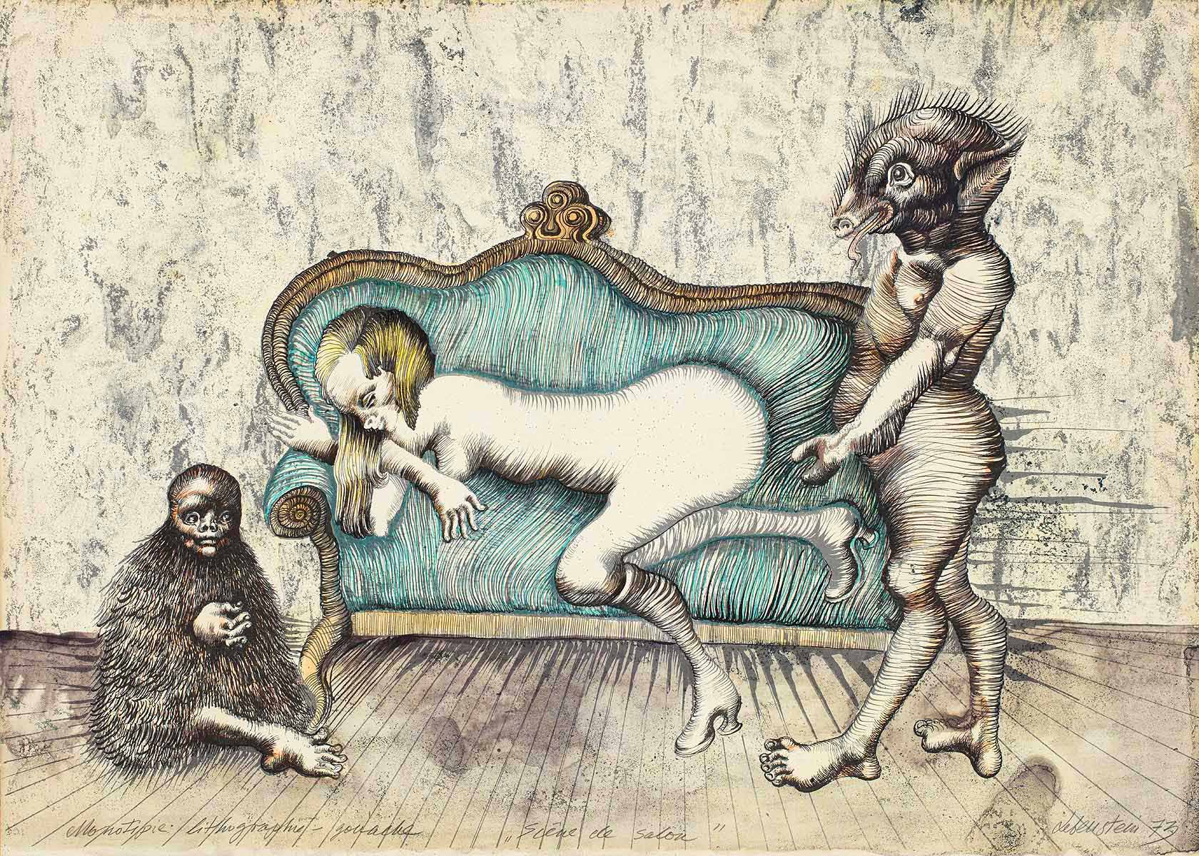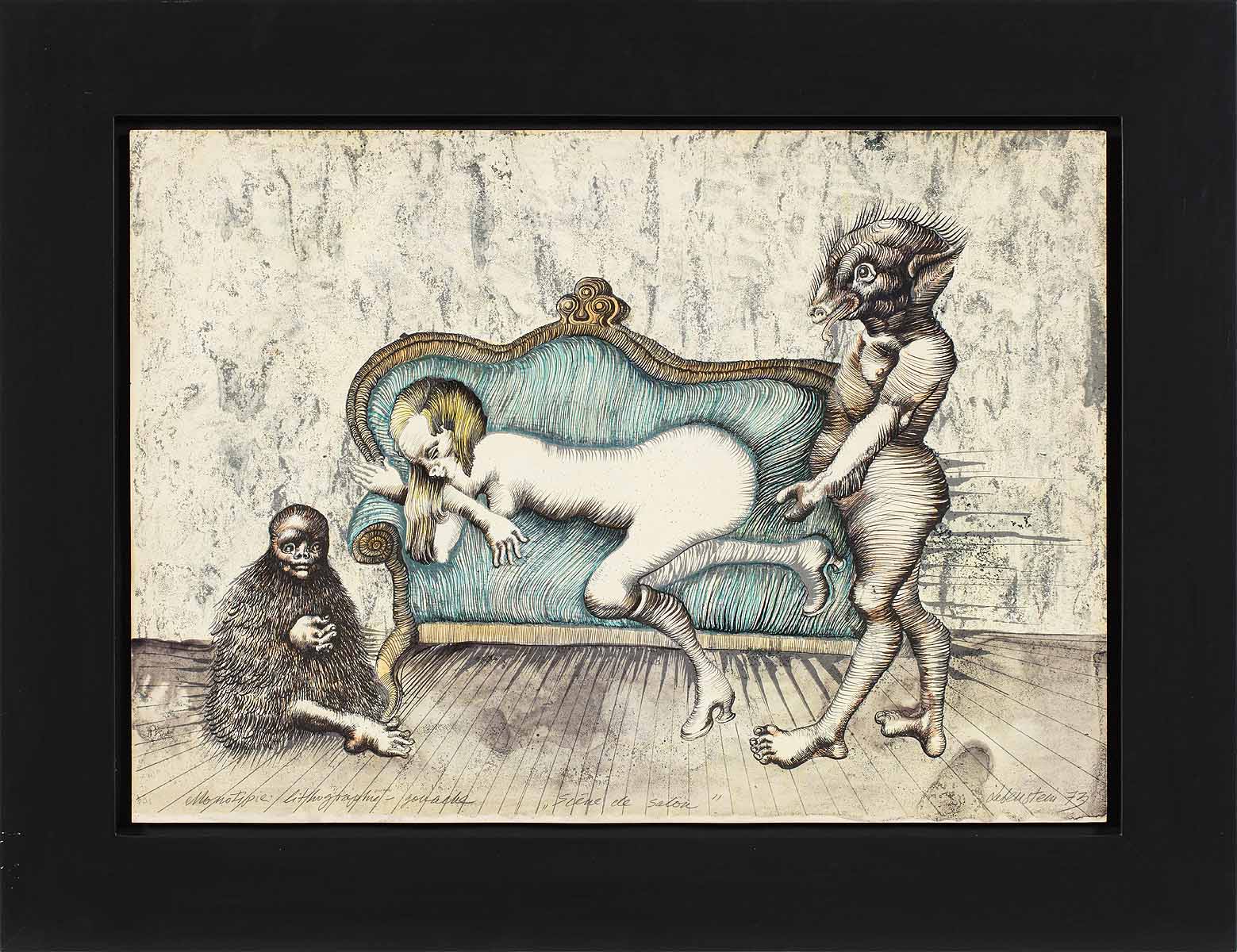 Prezentowana praca to pierwowzór jednej z najbardziej znanych i wielokrotnie wystawianych i reprodukowanych litografii autorstwa Jana Lebensteina. Kompozycja układem postaci nawiązuje do klasycznego dla malarstwa europejskiego tematu „Zuzanna i starcy”. Jednak znana biblijna historia w recepcji artysty zostaje mocno przeformułowana. Skromna i niewinna, starotestamentowa Zuzanna – staje się tu zmysłową kusicielką. Niczym salonowa lwica, leży na rokokowej sofie, ze świadomością eksponującą swoje nagie ciało. Jej towarzyszami – zamiast starych mężczyzn – są dwa mityczne, humanoidalne potworki, jakby wprost zaczerpnięte z płótna Johanna Füssliego „Nocna mara” (1781). Oferowane dzieło charakteryzuje interesująca technika wykonania. Monotypia, pierwotnie odbita jedynie w dwóch barwach i czerni, została przez artystę wzbogacona rysunkiem w pastelu i akwarelą – co wzmocniło kolorystykę pracy. Strukturalny efekt tła wraz z rytmiczną, miękką kreską stworzyły harmonijną całość kompozycyjną.