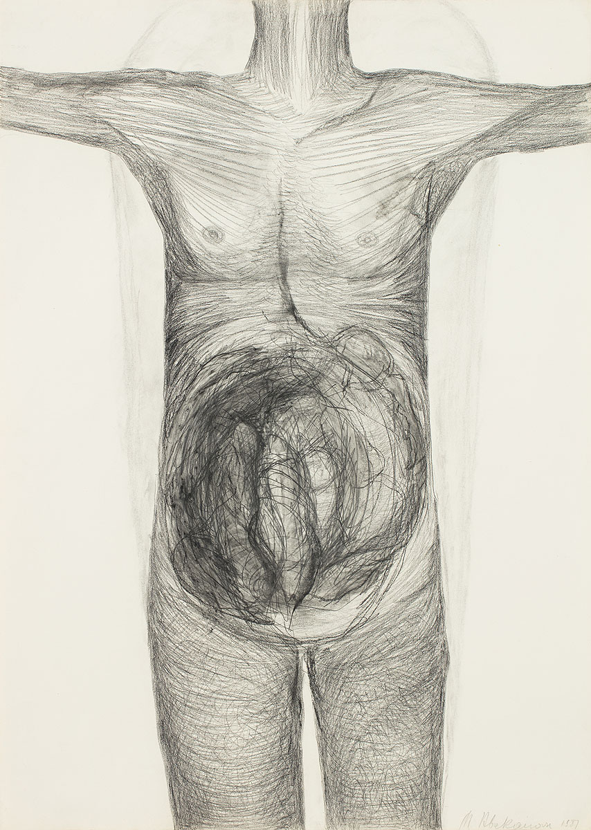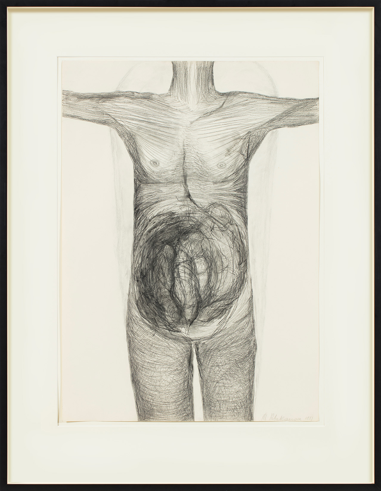 Znana przede wszystkim dzięki zespołom rzeźbiarskim i tkaninie Magdalena Abakanowicz tworzyła również rysunki i grafiki, które pozostają bardzo cenną częścią jej dorobku. Pełnoplastyczne rysunki, szkice i projekty późniejszych realizacji przestrzennych, wykonywane przez artystkę gwaszem, tuszem, metodą kolażu i węglem, to dowód na kompletną i spójną wizję artystyczną, w której dominującym elementem była refleksja nad człowiekiem jako jednostką indywidualną i częścią zbiorowości. Na przełomie lat 70. i 80. Abakanowicz tworzy serie rysunków i prac malarskich – „Korpusy”, „Twarze”, „Głowy”, „Twarze nie będące portretami”. Poddaje ciało ludzkie własnym skrupulatnym oględzinom. Oferowany rysunek należy do serii większych formatowo i realistyczniej potraktowanych kompozycji przedstawiających korpus ludzki. Stworzony w 1987 nawiązuje formalnie do cyklu „Korpusy” rozpoczętego w roku 1981. W przeciwieństwie jednak do swoich poprzedników rysunek cechuje większa szczegółowość anatomiczna. Centralnym motywem pozostaje wydęty brzuch, który jawi się jako plątanina tkanek, organ żyjący własnym życiem. Przywodzi na myśl słowa Magdaleny Abakanowicz, która wspominała dziecinne doświadczenia: „Byłam bardzo mała. Przykucnięta nad bagnistym stawem obserwowałam kijanki. […] Przez cienką błonę pokrywającą rozdęte brzuchy, widać było wyraźnie plątaninę zwojów kiszek. […] Wyciągnięte patykiem na brzeg, dotknięte nieostrożnie, nadęte brzuchy pękały. Zawartość wypływała rozlanym bezładem zasupłań. […] Siedziałam z bijącym sercem, wstrząśnięta tym, co się stało. Zniszczeniem miękkiego życia i bezbrzeżną tajemnicą zawartości miękkiego. […] Po wielu latach materiałem moim stało się to, co miękkie, o skomplikowanej tkance.” (Magdalena Abakanowicz, wyd. Centrum Sztuki Współczesnej – Zamek Ujazdowski, Warszawa 1995, s. 40). Korpusy z tętniącymi brzuchami symbolizują odkrywanie wewnętrznej struktury, bezbrzeżną tajemnicę wnętrza. Z dziecinnych obserwacji zrodziło się w artystce zamiłowanie do pracy z materiałami o skomplikowanej tkance. Były one dla niej bliskie, pokrewne ze światem, który badała dotykiem i który był zarazem częścią jej własnego noszonego najgłębiej świata.