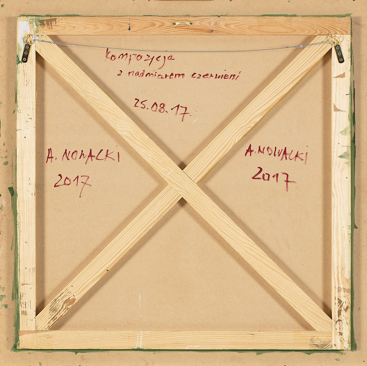 Andrzej Nowacki jest artystą kojarzonym z op-artem. Od 1988 roku w swojej sztuce posługuje się językiem geometrii, tworząc barwne reliefy. Jego charakterystyczne prace nie sposób przypisać komukolwiek innemu. Realizując kwadratowe kompozycje skonstruowane z rytmicznych trójwymiarowych linii, zaprasza widza do kreowania własnego doświadczenia wizualnego. Poszczególne listewki, pomalowane różnokolorową farbą, wywołują zmienne efekty w zależności od punktu obserwacji i naszego ruchu. Raz kompozycja może jawić się jako niebieska, a pod innym kątem będzie z kolei czerwona. Pełne doświadczenie wizualne uzyskamy przemieszczając się wzdłuż obrazu. Kolory zaczną wówczas wibrować, zmieniać się i odkrywać przed nami swoje nowe kolejne oblicza. Nowacki opanował niezwykłą umiejętność poruszenia statycznego reliefu i nadania mu iluzji ruchu. Sam artysta wypowiadał się o swoich pracach: „Podstawową wartością w mojej pracy twórczej jest kolor. (…) W dialogu z odbiorcą tworzy słowa języka nieświadomego, jest źródłem energii. (…) W czasie powstawania obrazu kombinacje kolorów i ich odcieni krystalizują się w strumieniu odczuwania emocji. Tonacje barw są kreowane wzruszeniem, działają bezpośrednio, bez barier myślowych, nie ma tu dystansu, kalkulacji i rozważań. Geometryczne ograniczenie barw na zrównoważonej płaszczyźnie kwadratu, rozdzielenie ich linią powoduje wewnętrzną wibrację i napięcia, wywołuje emocje, które są bardziej swobodne (…). Chwila, w której namalowany obraz zaczyna samodzielnie istnieć, szukając swojego miejsca w dialogu z odbiorcą, to moment najistotniejszy” (Nowacki A., Szepty barw, tekst autorski artysty). Kompozycje Nowackiego stanowią bezustanne źródło niespodzianek, odkryć i inspiracji. Posługując się językiem koloru, zapraszają do dialogu i kontemplacji – by choć na chwilę oderwać się od powszedniości życia i zatracić w wzruszających podszeptach barw.