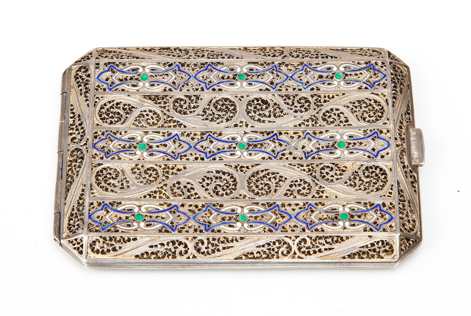 Prostokątna, o fazowanych krawędziach, zdobiona filigranem z motywem wici roślinnej i emalią białą, zieloną i błękitną; wnętrze złocone. Austro-Węgry, po 1866.