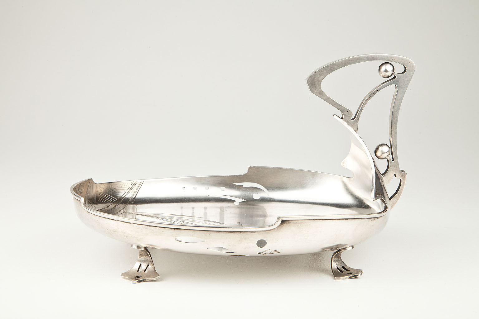 Na 4 ażurowych nóżkach, owalna, z grawerowanym monogramem wiązanym „ESB” (cyrylicą), na tle motywów roślinnych. Asymetryczny, ażurowy, łamany uchwyt ozdobiony 2 kulistymi elementami. Rosja, Moskwa, po 1908.