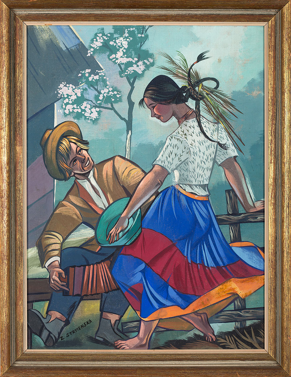 Określana mianem „pierwszej damy polskiego malarstwa dwudziestolecia międzywojennego” czy wręcz „księżniczki malarstwa polskiego”. Zofia Stryjeńska – malarka i ilustratorka, plakacistka, scenografka, znana z kontrowersyjnego, pełnego fantazji stylu bycia. Jej twórczość została głęboko zakorzeniona w formach zaczerpniętych ze sztuki ludowej. Umiejętnie łączyła rysunek z malarstwem, pracując w różnych technikach – od olejów, poprzez gwasze i tempery, na akwareli kończąc. Stosowała czyste, ostre barwy i lekko geometryzujące formy w stylu art-deco, gdzie tematem kompozycji był zawsze polski folklor – obrzędy, tańce i stroje.