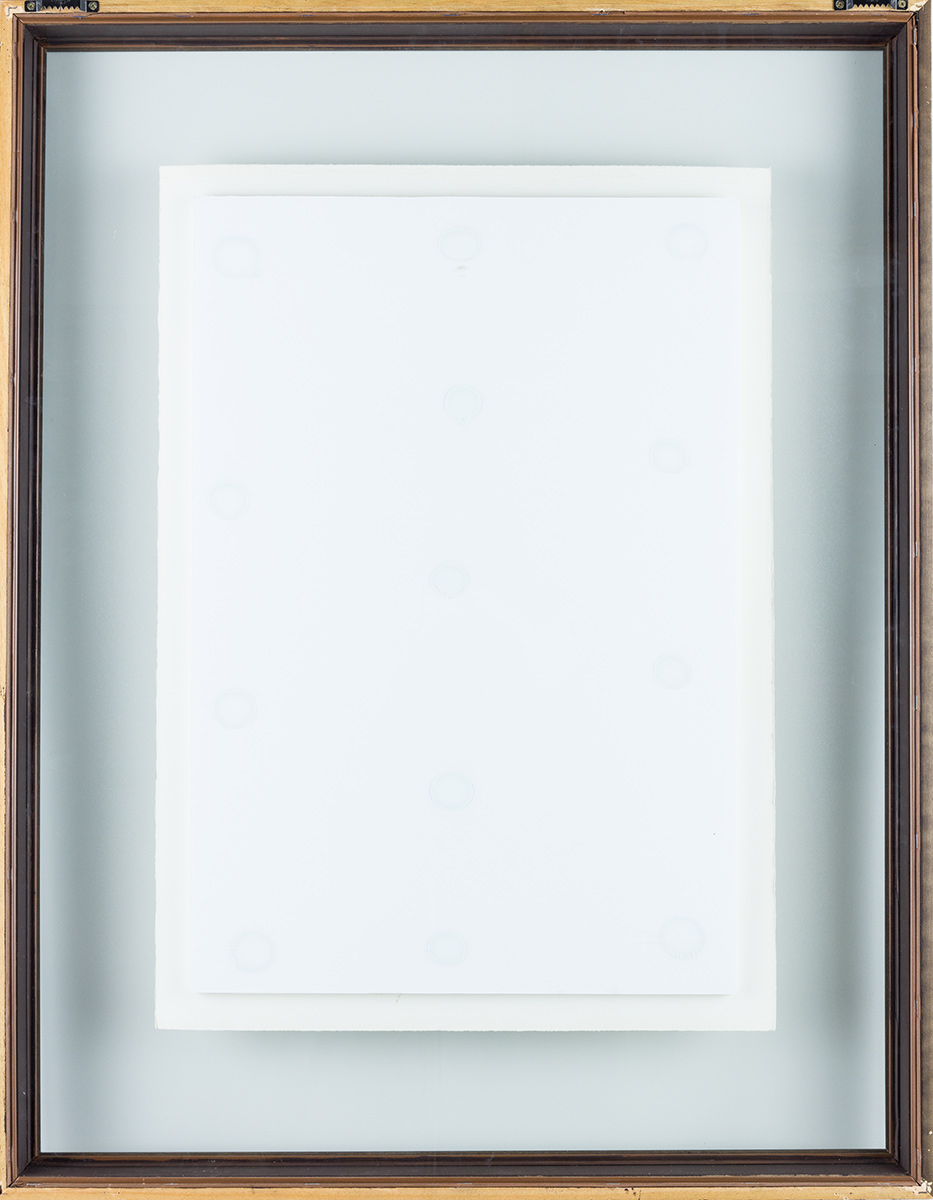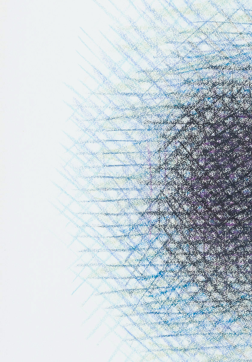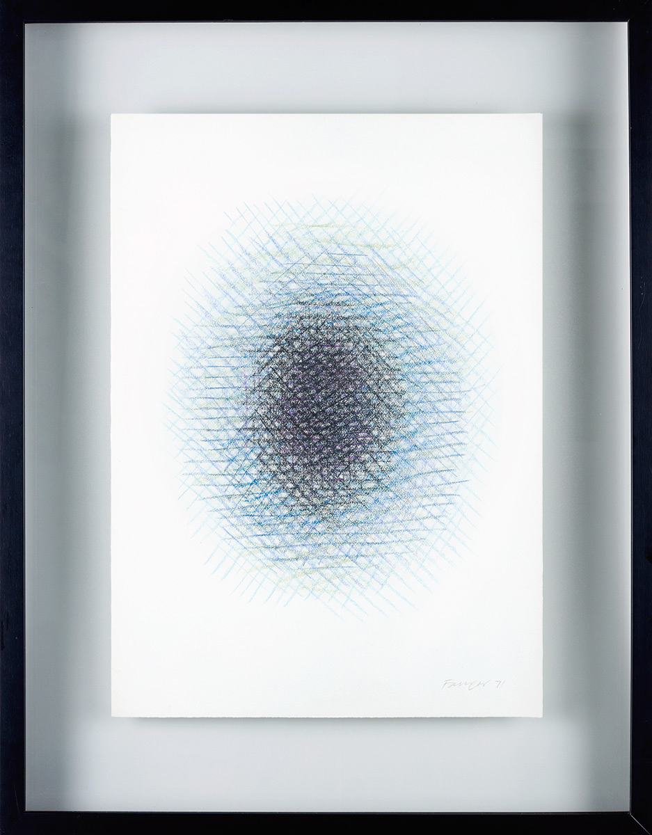 Prezentowana praca pochodzi ze szczytowego okresu twórczości Wojciecha Fangora – op-artowskich poszukiwań przestrzeni uzyskanej na płaszczyźnie obrazu kolorem i kształtem. Rysunki, które uzupełniają ouvre artysty, były naturalnymi dla procesu twórczego poszukiwaniami i próbami, ich ważnym etapem, ale też momentem krystalizowania się finalnej kompozycji malarskiej. Wiele z nich nosi w sobie cechy kompozycji autonomicznej, w pełni ukończonej, czego dowodzi nie tylko drobiazgowość opracowania ale też ich duży format. Te rysunkowe kompozycje op-artowskie, dają możliwość wglądu w proces twórczy, zwłaszcza ten czysto plastyczny. Zupełnie inaczej niż na finalnych kompozycjach olejnych, gdzie kompozycja stworzona jest z barw nieomal dyfuzyjnie przenikających się i niepostrzeżenie zlewających się w iluzję kształtu, na rysunkach Fangora widzimy ten proces rozłożony na wyraźne części. To setki pojedynczych kresek i dotknięć w konkretnych barwach, których grupy nakładają się falami i dopiero z pewnej odległości, myląc wzrok, dają złudzenie powstawania barw pochodnych i kształtów, osiągając dojrzały efekt analogiczny do obrazów olejnych artysty.