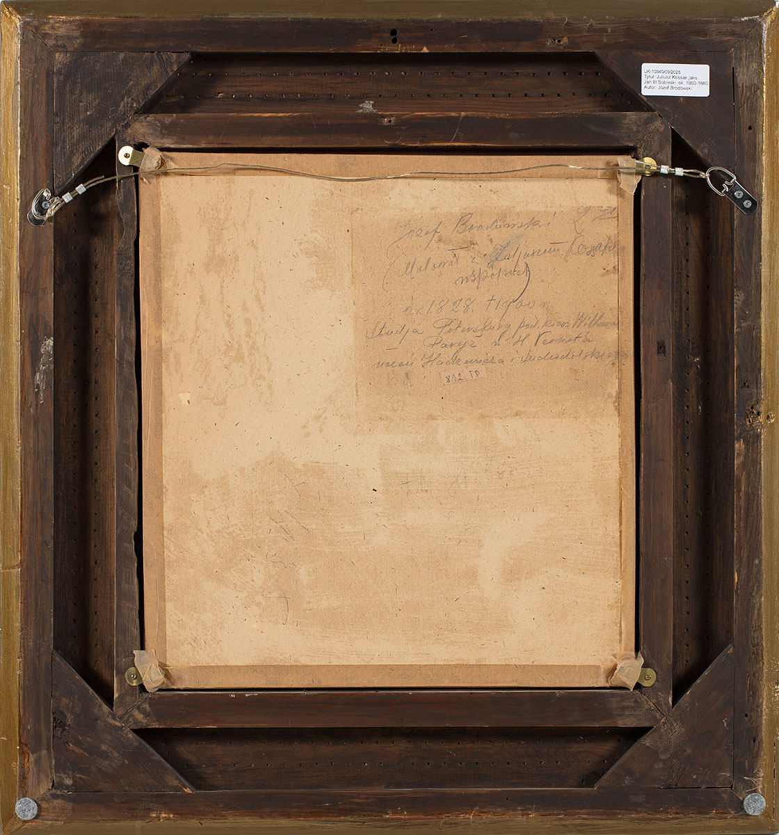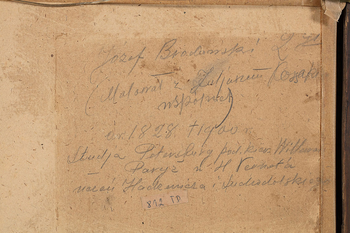sygn. monogramem p.d.: JB, na odwrociu obrazu odręczna adnotacja ołówkiem: Józef Brodowski 2.71 / (Malował z Juliuszem Kossakiem / wspólnie) / ur. 1828 / Studia w Petersburg pod kier. Willewalde ? Paryż u H.Verneta / Uczeń Hadziewicza i Suchodolskiego.