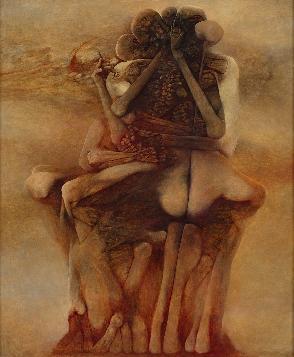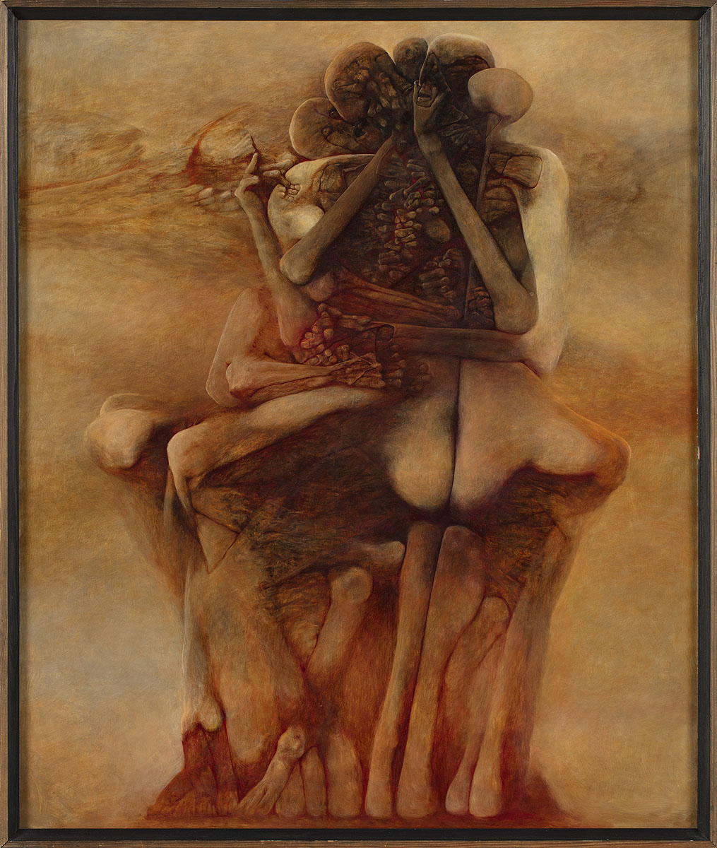 Oferowana kompozycja FE z 1989 roku przedstawia misterną konstrukcję, w której dopiero po chwili można dopatrzyć się elementów ludzkich ciał. Kłębowisko członków zdaje się być zespolone z neutralnym tłem nieokreślonej przestrzeni. Nie ma wyraźnie zaznaczonej granicy między poszczególnymi członkami ciała oraz między samym ciałem a światem. Ramię zlewa się z twarzą, z śródpiersia wystają palce. Te poszczególne elementy nie mają też nic wspólnego z ciałem ludzkim znanym z kart atlasu anatomicznego. „Anatomia na moich obrazach jest całkowicie fantastyczna, ale fantastyczna w ten sposób, by na pozór sprawiała wrażenie, że wszystko jest ok. Po prostu bawię się tak samo anatomią jak chmurami i morzem, pejzażem czy architekturą; jest to zawsze coś nieprawdopodobnego w sensie realistycznego oglądu” – pisał Beksiński (cyt. za: Iwan E., Zdzisław Beksiński – Życie i twórczość, Lublin 2006, [rozprawa magisterska, Katolicki Uniwersytet Lubelski]). Oferowana kompozycja w sensie warsztatowym jest kontynuacją poprzedzających ją prac. Faktura materii, a raczej całkowity jej brak, odzwierciedlają przywiązanie do rysunku i fotografii, dwóch dziedzin sztuki, które Beksiński z powodzeniem uprawiał zanim w 1964 roku przeszedł do malarstwa sztalugowego. W malarstwie jego przetrwały cechy wyćwiczonej kreski i nieskazitelnej powierzchni. Brak faktury nie oznacza jednak braku plastyczności, a figura ludzka w sposób szczególny odpowiadała Beksińskiemu w owych poszukiwaniach. Kilkukrotnie wspominał, że zarówno ciało stanowi dla niego nieskończone źródło improwizacji malarskiej, co doskonale widoczne jest w oferowanym obrazie. W czasach, kiedy tworzył Beksiński jego obrazy gorszyły lub przerażały były więc przeznaczone dla ograniczonego kręgu odbiorców. Dziś cieszą się wielką popularnością wśród szerokiego grona kolekcjonerów. Skrajne stany i emocje im towarzyszące – krzyk, ciemność, strach, rozpacz, absurd i samotność – stały się poniekąd chlebem powszednim współczesnego świata a oswojenie ich obecności koniecznością.