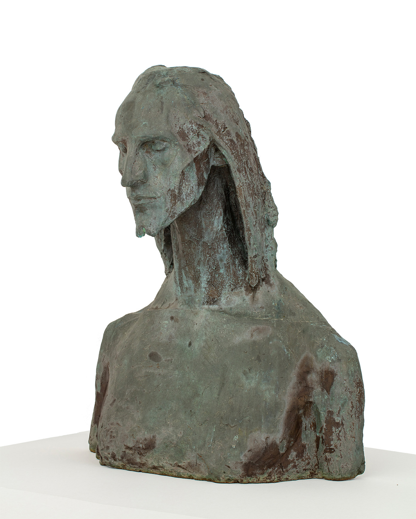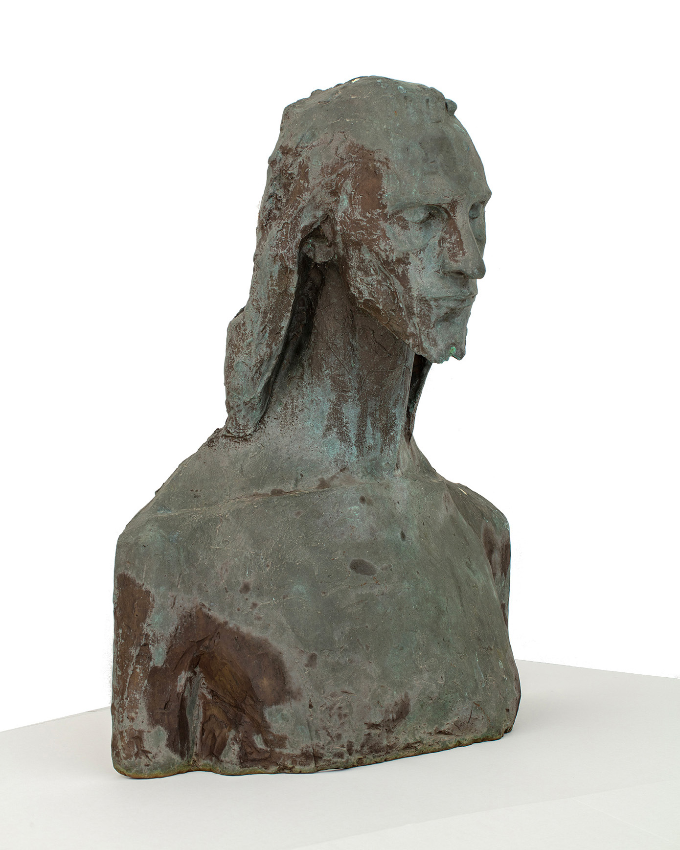 Rzeźby religijne Xawerego Dunikowskiego w wyjątkowy sposób łączą ducha gotyckiej tradycji z nowoczesnym, modernistycznym podejściem do formy. W prezentowanym monumentalnym popiersiu od razu rozpoznajemy pełną powagi postać Chrystusa. Smukła sylwetka, spokojny wyraz twarzy, szerokie czoło i opadające ramiona tworzą kompozycję o wyjątkowej sile wyrazu i głębi emocjonalnej. „Widzimy (…) studjum biustu, gdzie głowa Chrystusa o wyrazistym i twardym profilu, pełna tajonego smutku i znamionująca bogactwo przeżyć wewnętrznych, odpowiada pozatem całkowicie przyjętemu ogólnie typowi” – pisał o rzeźbie Mieczysław Treter (Treter M., Ksawery Dunikowski: próba estetycznej charakterystyki jego rzeźb, nakł. H. Altenberga, Lwów 1924, s. 32). Dzieło Dunikowskiego powstało jako jedno z dwóch popiersi, a zarazem kilku studiów przygotowawczych do większej realizacji – figury Chrystusa stanowiącej centralny element grupy Adoracji, wieńczącej główny portal kościoła OO. Jezuitów w Krakowie pw. Najświętszego Serca Pana Jezusa. Modernistyczną świątynię zaprojektował w latach 1907-1909 wybitny architekt Franciszek Mączyński, autor m.in. krakowskiego Pałacu Sztuki i Domu Pod Globusem. Rzeźbę Chrystusa do portalu wykonał w kamieniu Karol Hukan, według projektu Dunikowskiego, natomiast boczne postacie mnichów i rodziny – symbolizujące cierpiącą i poszukującą ukojenia ludzkość – odlano z ołowiu w 1913 roku. Zarówno zrealizowana figura, jak i wcześniejsze studia – w tym prezentowane popiersie – przemawiają językiem monumentalnym, dostojnym, pełnym skupienia. Utrzymane w charakterystycznym dla Dunikowskiego stylu – surowym, syntetycznym i duchowo pogłębionym – ukazują artystę w momencie poszukiwania uniwersalnego, ponadczasowego wyrazu sacrum w rzeźbie.