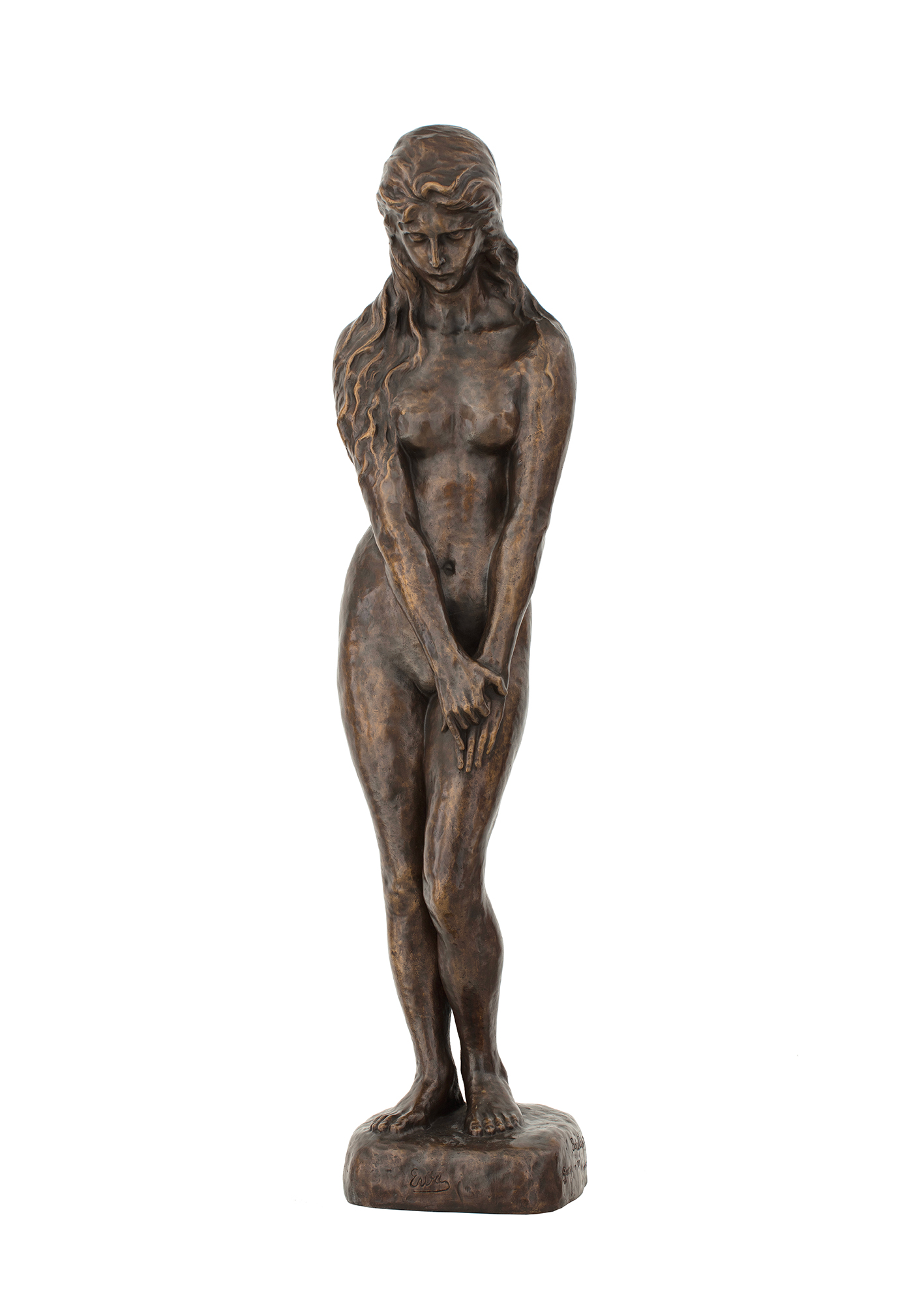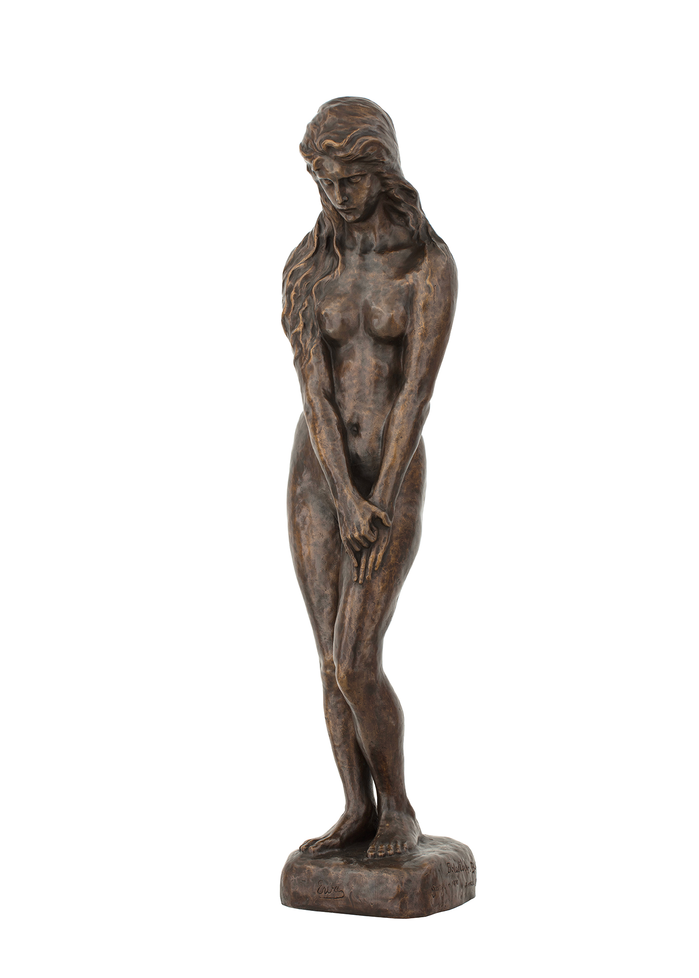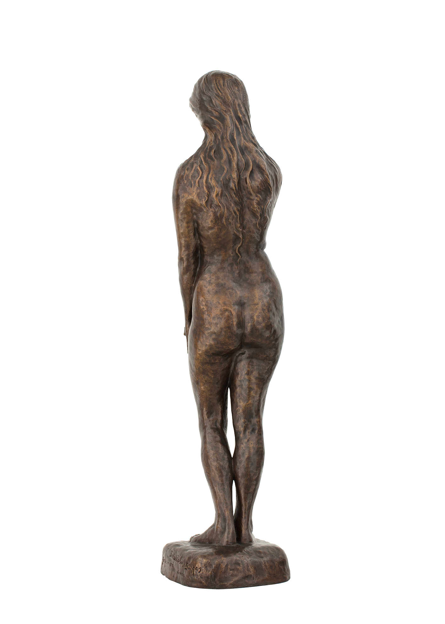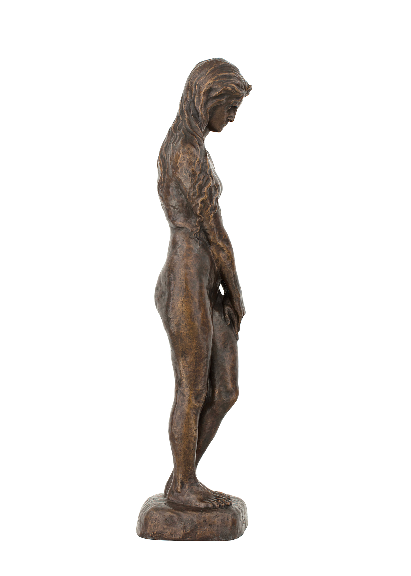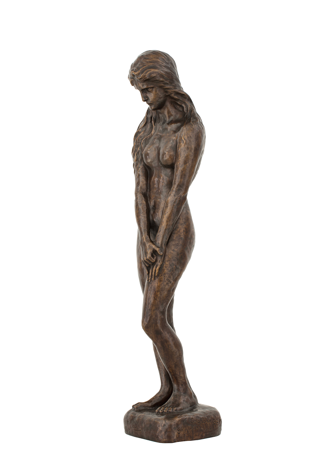 Wraz z początkiem nowego stulecia Bolesław Biegas był już postacią doskonale rozpoznawalną na paryskiej scenie artystycznej. Niezależny talent, obrosły legendami i skandalami, wzbudzał żywe zainteresowanie kolekcjonerów oraz krytyków. Około 1910 roku w twórczości rzeźbiarskiej artysty widoczny staje się wyraźny zwrot ku rzeźbie pełnej. Jednocześnie coraz silniej fascynuje go temat aktu, a płeć przedstawianych postaci zostaje jednoznacznie określona. W tym czasie powstają dwie odpowiadające sobie kompozycje o starotestamentowej tematyce – „Adam” oraz „Ewa”. Prezentowany odlew z brązu ukazuje biblijną pierwszą kobietę w pełnej pokory, niemal skurczonej pozie. Lekko przygarbiona, z dłońmi splecionymi przed sobą, kieruje wzrok niepewnie ku górze. Na jej twarzy malują się przygnębienie i lęk – emocje wynikające z nieposłuszeństwa wobec Boga i spożycia zakazanego owocu. Haptycznie opracowana figura, modelowana ze wszystkich stron, zdradza drobne deformacje i subtelne zachwiania proporcji. Te niewielkie niedoskonałości rekompensuje jednak symboliczna wymowa oraz silna ekspresja dzieła. Ciało Ewy zdaje się napięte, a jej oblicze ujawnia wewnętrzny dramat – świadcząc o wyjątkowej wrażliwości i talencie Biegasa.