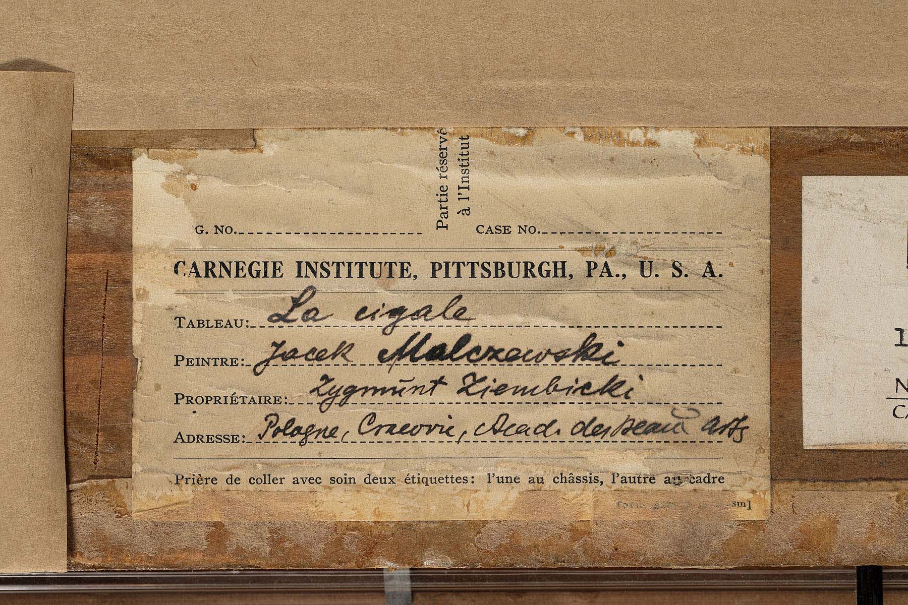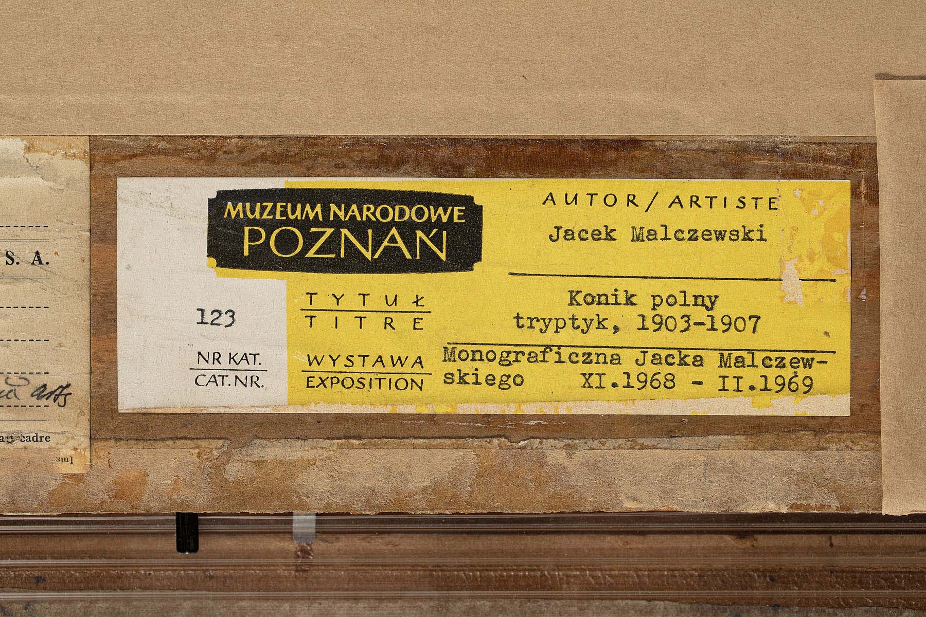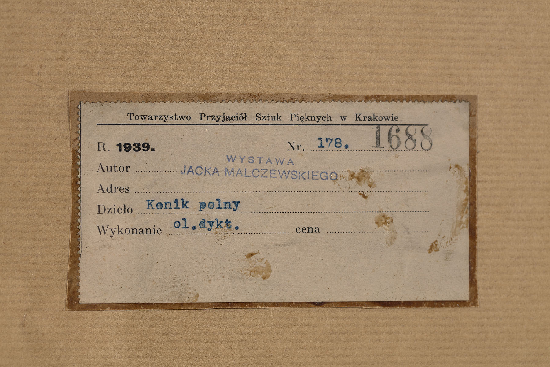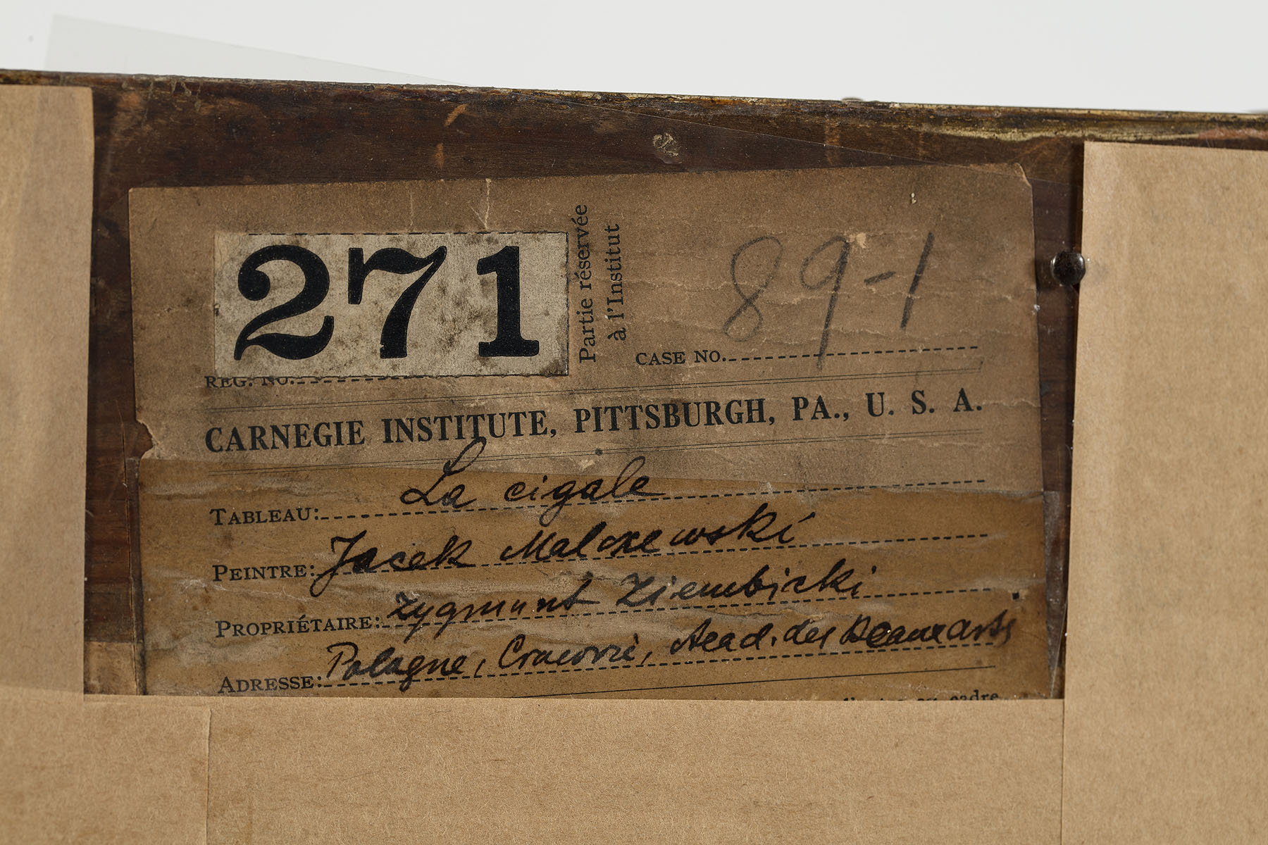 na ramie pięć nalepek – od lewej: nalepka (maszynopis): Zbiory Miejskie Krak. / Dzp. 43/44 / Dep. P. Zygmunta Ziembickiego; nalepka (druk, tusz): [RE] G. NO / CASE NO / CARNEGIE INSTITUTE, PITTSBURGH, PA., U.S.A. / TABLEAU La cigale / PEINTRE Jacek Malczewski / PROPRIÉTAIRE Zygmunt Ziembicki / ADRESSE Pologne, Cracovie, Acad. des Beaux Arts / Priere de coller avec soin deux étiquettes: l’une au châssis, l’autre au cadre; nalepka Muzeum Narodowego w Poznaniu (druk, maszynopis): AUTOR/ARTISTE Jacek Malczewski / TYTUŁ/TITRE Konik polny / tryptyk, 1903-1907 / WYSTAWA/EXPOSITION Monograficzna Jacka Malczew / skiego XI 1968-II. 1969 / NR CAT./ CAT NR 123; nalepka (druk, tusz): 271 / REG. NO. CASE NO [oł.]: 89-1 / CARNEGIE INSTITUTE, PITTSBURGH, PA., U.S.A. / TABLEAU La cigale / PEINTRE Jacek Malczewski / PROPRIÉTAIRE Zygmunt Ziembicki / ADRESSE Pologne, Cracovie, Acad. des Beaux Arts / […] au cadre zdarta nalepka kolekcjonerska z czerwonym otokiem (tusz): 5 (…) / J (…) oraz na tzw. „zaplecku“ dwie nalepki: nalepka (druk, niebieski długopis): TOW. PRZYJACIÓŁ SZTUK PIĘKNYCH W KRAKOWIE / Autor Jacek Malczewski / Tytuł dzieła Tryptyk „Konik polny“ 1907 / Rodzaj dzieła olej-deska / Cena / Podpis autora (wł. Ziembicki); nalepka (druk, maszynopis): Towarzystwo Przyjaciół Sztuk Pięknych w Krakowie / R. 1939. Nr 178. [pieczęć] 1688 / Autor [pieczęć] WYSTAWA JACKA MALCZEWSKIEGO / Adres / Dzieło Konik polny / Wykonanie ol., dykt. / cena …