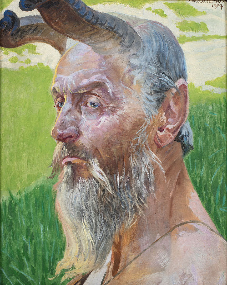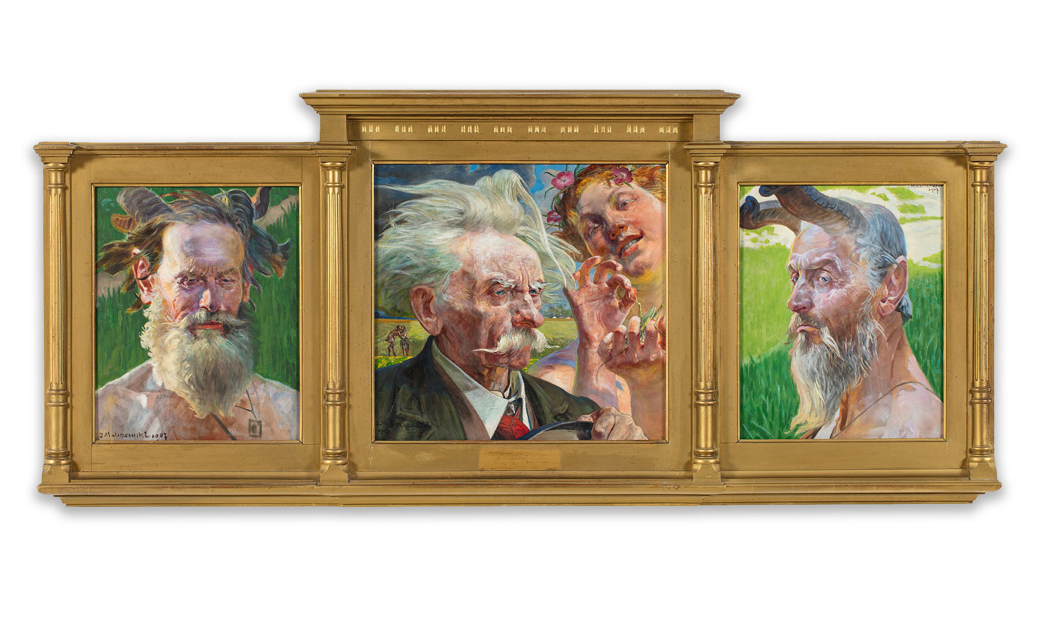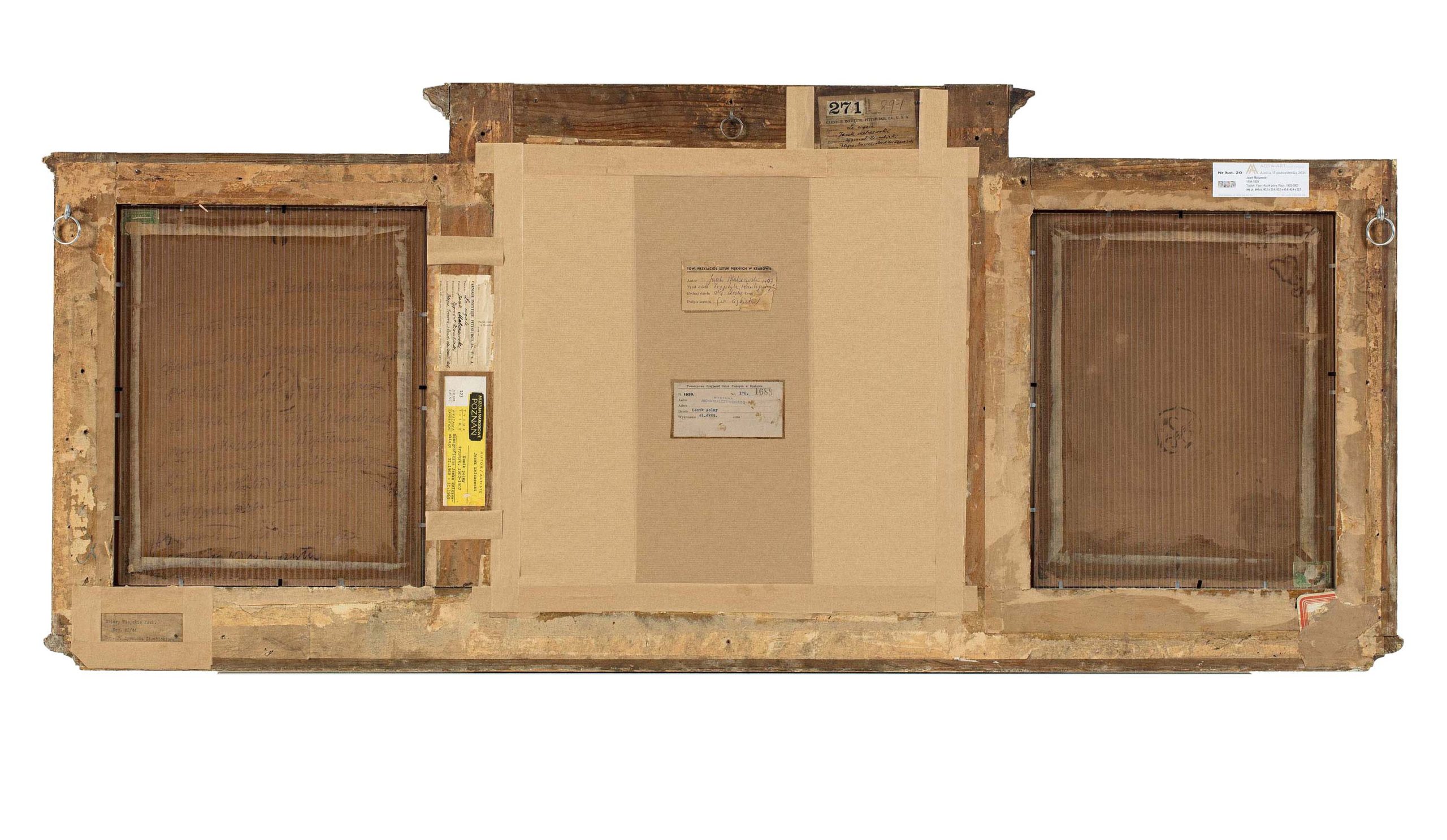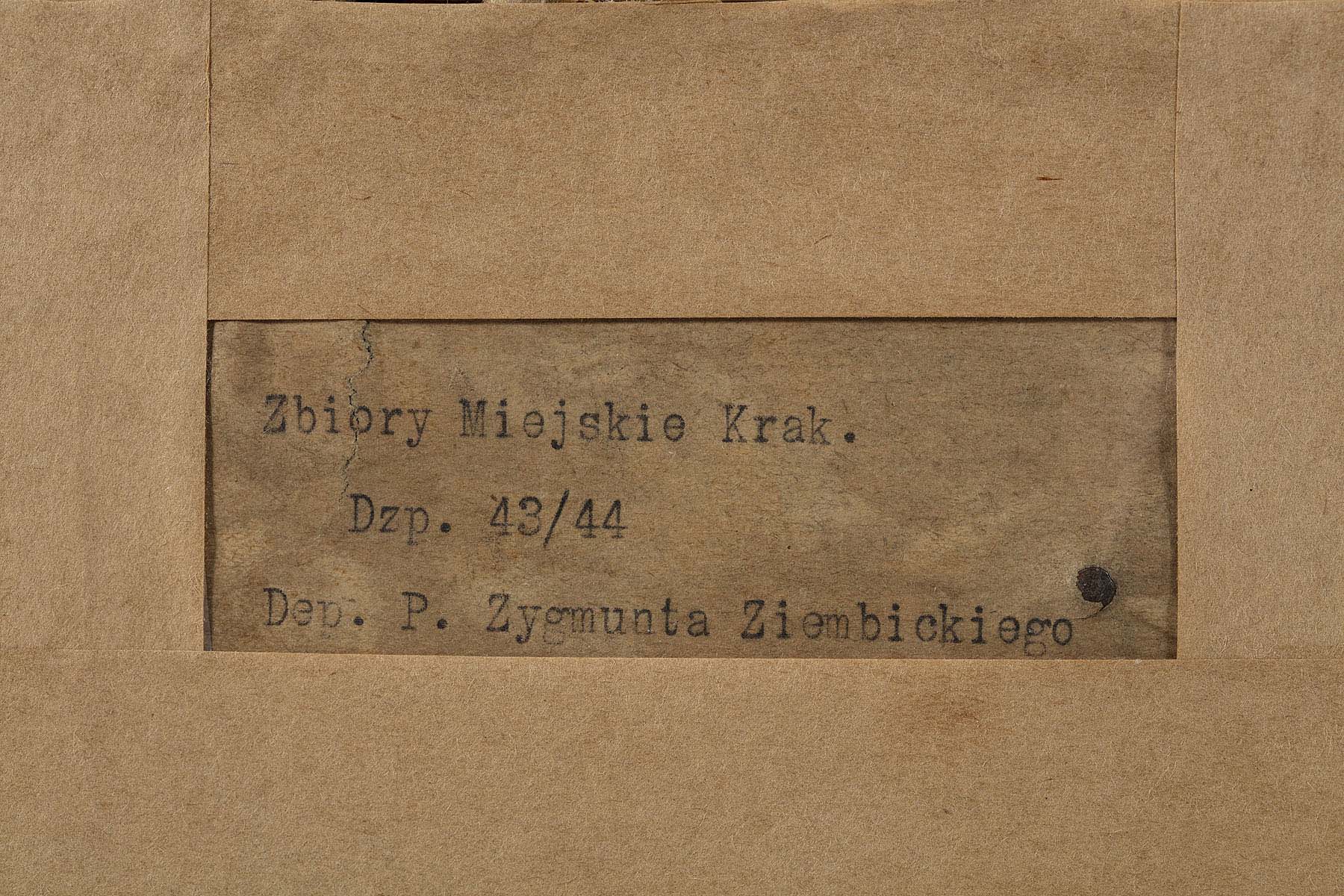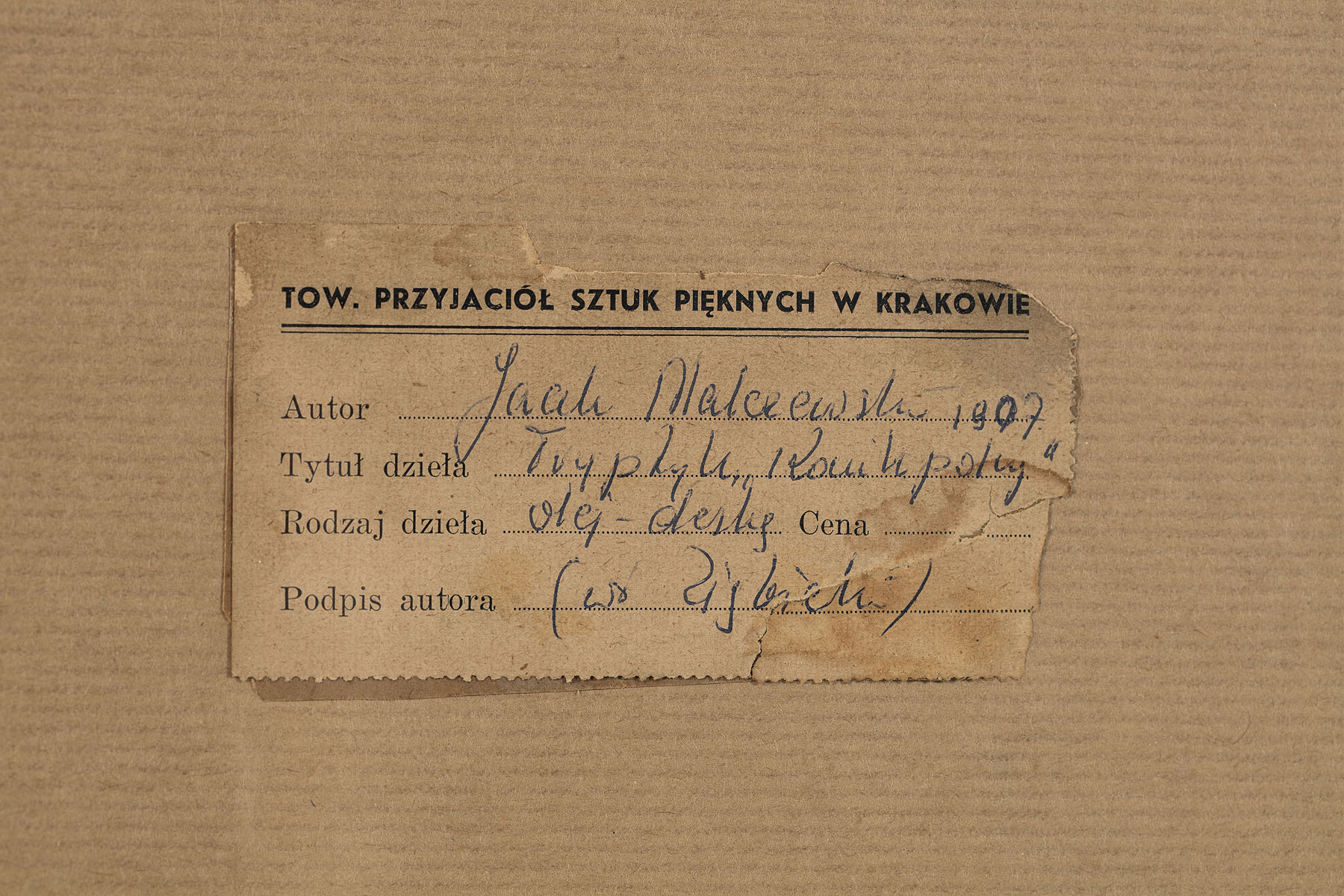 na ramie pięć nalepek – od lewej: nalepka (maszynopis): Zbiory Miejskie Krak. / Dzp. 43/44 / Dep. P. Zygmunta Ziembickiego; nalepka (druk, tusz): [RE] G. NO / CASE NO / CARNEGIE INSTITUTE, PITTSBURGH, PA., U.S.A. / TABLEAU La cigale / PEINTRE Jacek Malczewski / PROPRIÉTAIRE Zygmunt Ziembicki / ADRESSE Pologne, Cracovie, Acad. des Beaux Arts / Priere de coller avec soin deux étiquettes: l’une au châssis, l’autre au cadre; nalepka Muzeum Narodowego w Poznaniu (druk, maszynopis): AUTOR/ARTISTE Jacek Malczewski / TYTUŁ/TITRE Konik polny / tryptyk, 1903-1907 / WYSTAWA/EXPOSITION Monograficzna Jacka Malczew / skiego XI 1968-II. 1969 / NR CAT./ CAT NR 123; nalepka (druk, tusz): 271 / REG. NO. CASE NO [oł.]: 89-1 / CARNEGIE INSTITUTE, PITTSBURGH, PA., U.S.A. / TABLEAU La cigale / PEINTRE Jacek Malczewski / PROPRIÉTAIRE Zygmunt Ziembicki / ADRESSE Pologne, Cracovie, Acad. des Beaux Arts / […] au cadre zdarta nalepka kolekcjonerska z czerwonym otokiem (tusz): 5 (…) / J (…) oraz na tzw. „zaplecku“ dwie nalepki: nalepka (druk, niebieski długopis): TOW. PRZYJACIÓŁ SZTUK PIĘKNYCH W KRAKOWIE / Autor Jacek Malczewski / Tytuł dzieła Tryptyk „Konik polny“ 1907 / Rodzaj dzieła olej-deska / Cena / Podpis autora (wł. Ziembicki); nalepka (druk, maszynopis): Towarzystwo Przyjaciół Sztuk Pięknych w Krakowie / R. 1939. Nr 178. [pieczęć] 1688 / Autor [pieczęć] WYSTAWA JACKA MALCZEWSKIEGO / Adres / Dzieło Konik polny / Wykonanie ol., dykt. / cena …