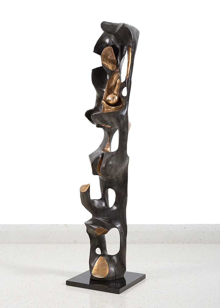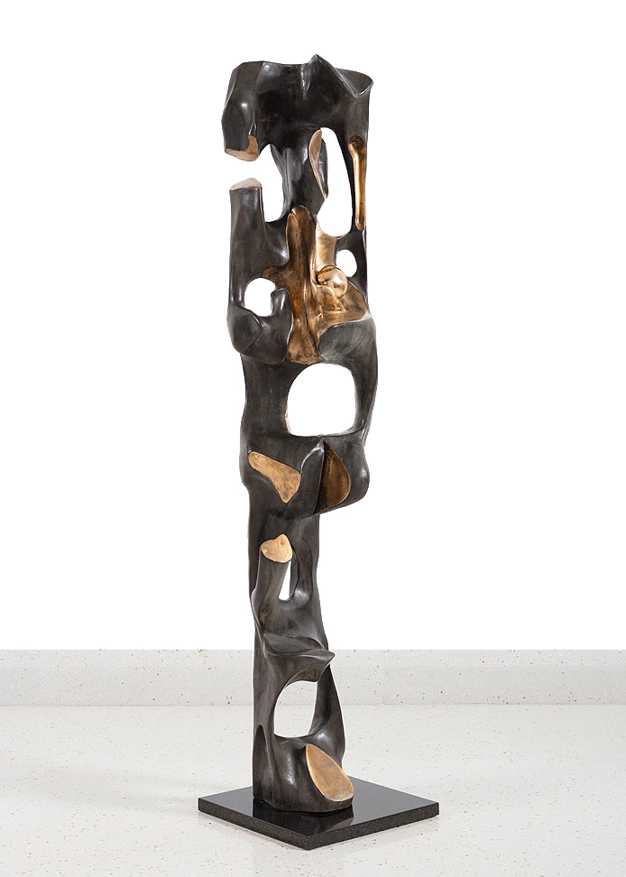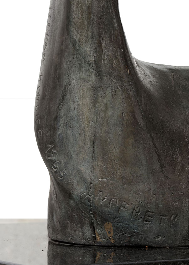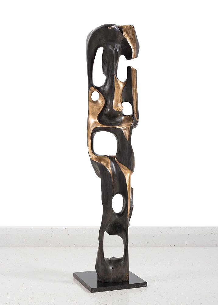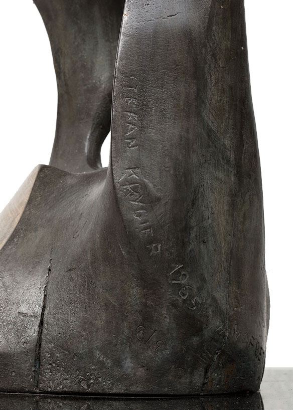 Sztukę Stefana Krygiera można zdefiniować jako konsekwentne poszukiwanie nowych środków wyrazu formy, która – jak wskazywał – byłaby czystą „emanacją przestrzeni”. To zainteresowanie obecną w dziele przestrzenią zrodziło m.in. serię prac z lat 60., w której artysta starał się przełożyć na język współczesny tradycje sztuki starożytnego Egiptu. Krygiera szczególnie pociągał zmysł matematyczny kompozycji i bryły, jej dekoracyjność oraz kunszt konstrukcji, cechujący dzieła starożytnych mistrzów. Oferowana praca jest odlewem z brązu wykonanej w 1965 roku drewnianej rzeźby „Nofret”. Dzieło stanowi kontynuację zainicjowanego rok wcześniej cyklu „Dolina Królów” i należy do owych nowatorskich form artystycznych, które wymykały się klasycznej definicji rzeźby i stąd prowokowały u Krygiera poszukiwania nowego nazewnictwa. Artysta preferował określenie „forma”, którym posługiwał się zarówno w swojej pracy artystycznej, jak i teoretycznej. Sztuka Krygiera wynika z pewnej kontynuacji postawy twórczej Władysława Strzemińskiego – związana jest z archeologią formy i badaniem form historycznych w perspektywie ich potencjału, siły oraz żywotności dla nas tu i teraz. „Nofret” to jeden z pierwszych obiektów przestrzennych Krygiera, imponujący artystycznym radykalizmem i mądrością. Nadrzędną wartością dzieła jest jego forma, której wszystko podlega i która wymusza sposób obróbki materii. Konstruowana w przestrzeni praca, jest otwarta na rozproszenie i penetrację otoczenia. Ma ona swojego prekursora w rzeźbie „Nofret I” z 1964 roku, również oryginalnie wykonanej w drewnie, choć o mniejszych wymiarach (110 x 16 x 4 cm) i znacznie słabiej potraktowanej głębi przenikających ją przestrzeni. „Nofret” stoi na początku drogi, jaką obrał Krygier w celu badania przestrzeni w dziele, jego tektoniki i architektoniki – studia te pogłębiał w latach 70. i 80. w kolejnych cyklach zatytułowanych „Konflikty” oraz „Ośrodki Kondensacji Formy”.