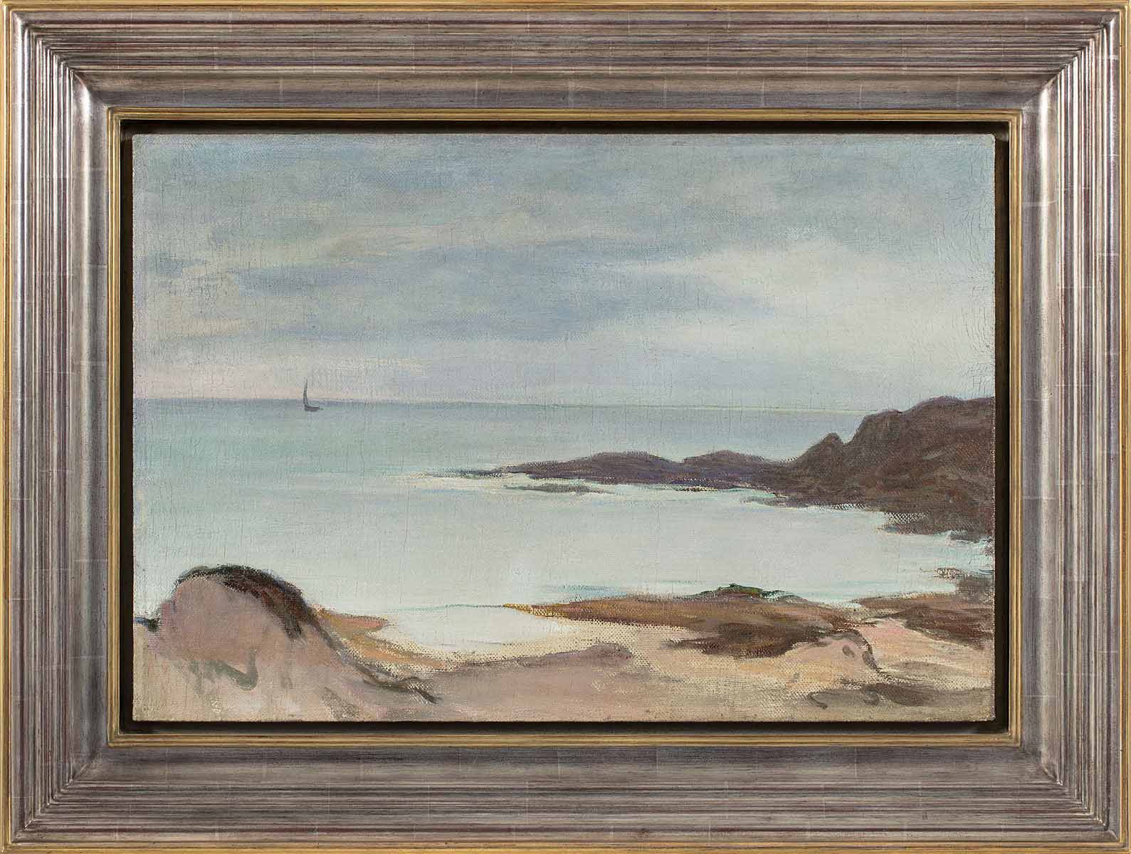 Spośród wszystkich gatunków malarskich Władysław Ślewiński najbardziej umiłował sobie pejzaż morski. Artysta, który malarzem został późno a mianowicie w wieku trzydziestu czterech lat, przybył do Francji w 1888. Tam, pochodzący z mazowieckich równin Ślewiński, zmierzył się po raz pierwszy z bezkresem wód oceanu. I była to miłość od pierwszego wejrzenia. W okresie od lat 90. XIX wieku do ok. 1914 roku stworzył kilkadziesiąt obrazów marynistycznych. Ich bohaterami stały się bretońskie wybrzeża okolic Le Pouldu a następnie Doëlan, miejscowości, w których artysta żył i pracował. Morze Władysława Ślewińskiego to żywioł, symbol zmienności oraz ponadczasowego trwania. Pejzaże zbudowane są z trzech zasadniczych elementów – wody, powietrza i ziemi. Artysta, na którym pierwszy kontakt z oceanem był wstrząsem artystycznym i psychicznym (Jaworska W., Władysław Ślewiński, Warszawa 1984, s. 20) szczególnie często akcentował grozę żywiołu morskiego, ukazując wybrzeże w czasie sztormu, z potężnymi spienionymi falami rozbijającymi się o skalne urwiska. Pejzaże te cechują się wyjątkową nastrojowością. Z kolei obrazy namalowane po 1910 roku przedstawiają to samo wybrzeże w skrajnie innej, zdecydowanie bardziej poetyckiej aurze. W okresie tym Ślewiński powraca w swym malarstwie do podstaw syntetyzmu, redukując motywy i środki malarskie. Przykładem takiego dzieła jest oferowany Pejzaż morski. Nie ma w nim śladu po wzburzonych falach, tafla wody jest spokojna i zdaje się łączyć w jedno z niebem i ziemią. Koloryt obrazu łagodnieje. Gama barw rozciąga się od tonów ciepłych, różowych i czerwonych laków, zgaszone brązy po tony zimne, szarozielone i błękitne. (Czyżewski T., Władysław Ślewiński, z serii: Monografje artystyczne, tom XVIII, wyd. Nakład Gebethnera i Wolffa, Warszawa 1928, s. 12). Daleko na horyzoncie jawi się element dopowiadający, w zasadzie nieobecny w malarstwie pejzażowym Ślewińskiego. Mały żaglowiec płynie bezszelestnie wzdłuż skalistego wybrzeża a jego obecność zdaje się dodatkowo podkreślać spokój pogodnego dnia.