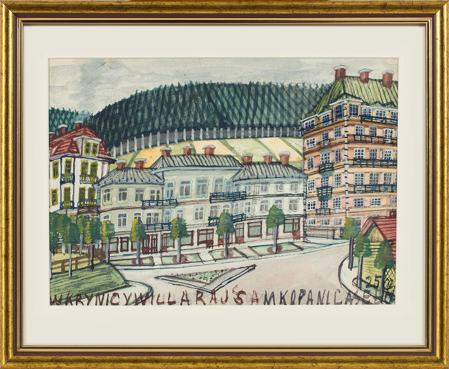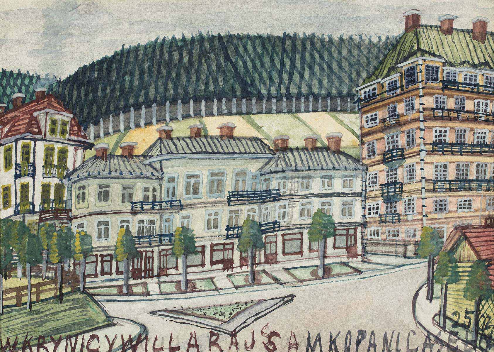 Nikifor (właśc. Epifaniusz Drowniak) uważany jest za jednego z najznakomitszych twórców tzw. naiwnych (prymitywistów) na świecie. Urodził się około 1895 roku. Był Łemkiem po matce, odziedziczył po niej również wadę słuchu i wymowy. Wychowany w nędzy, również przez wzgląd na ułomności nie odebrał nigdy pełnej edukacji, nauczył się jedynie pisania drukowanymi literami oraz czytania i podstaw liczenia. Osierocony w czasie I Wojny Światowej, funkcjonował na marginesie krynickiej społeczności jako włóczęga, żebrak, postać kuriozalna. Czuł jednak niesłychanie silną więź z tym miejscem, dwukrotnie w ramach akcji „Wisła” wywożony w odległy koniec Polski, z uporem wracał do rodzinnego miasta. „Matejko z Krynicy” którego sensem życia było malarstwo, wrósł w pejzaż uzdrowiskowego deptaku. Krynica była jego światem, a w nim najważniejszym miejscem była cerkiew. Miejsce gdzie prowadzała go matka, miejsce w którym czuł się niejako bezpiecznie. Bez względu na format, jego obrazki mają w sobie pewien ikoniczny monumentalizm, wyniesiony z ruskich ikon cerkiewnych, stanowiący pewną eklektyczną całość z „pamiątkarską” koncepcją miejskich widoków, portretów i ilustracji wybranych budynków uzdrowiskowej miejscowości. Otoczone dekoracyjną bordiurą z wzorkiem i oznaczone wyraźnym podpisem kompozycje zamykały i podsumowywały to co widział. Widoki miasteczek, w przeważającej większości Krynicy ale też Krakowa czy Warszawy, przeplatają się z widokami linii kolejowych, pejzaży, portretami przechodniów… Bardzo ważną częścią jego prac, pozwalającą nam wniknąć trochę w wewnętrzny świat, prawie głuchoniemego artysty są jego autoportrety. Bardzo liczne, głównie z lat 30tych, wymownie świadczą o jego sposobie postrzegania samego siebie i własnej roli a nawet misji. “Nikifor Biskup”, “Nikifor nauczający”, zamyślony, wytwornie ubrany, przy sztaludze, z gestem błogosławieństwa, często z podpisem „Pamiątka z Krynicy”. Swój warsztat nosił przy sobie, farbki, kredki, papierki urzędowe, zużyte zeszyty, opakowania czy kartoniki po zapałkach. Ten dobytek wielokrotnie konfiskowano w ramach walki z żebractwem, co było jednak daremne. Dla Nikifora bowiem malarstwo było mocą, sensem i celem jego istnienia. On zaś był artystą malarzem. Szacuje się, że Nikifor stworzył kilkadziesiąt tysięcy prac. Pierwszym, który rozpoznał w obrazkach krynickiego biedaka wielką sztukę był ukraiński malarz Roman Turyn. Mając ponad dwieście jego prac pokazał je członkom Komitetu Paryskiego, sztuka ta zachwyciła kapistów, prace te włączono do wystawy zbiorowej ekspozycji malarzy lwowskich i przedstawicieli École de Paris, przygotowanej przez lwowskie Ukraińskie Muzeum Narodowe w 1932 roku. Autorem pierwszej publikacji na temat Nikifora był Jerzy Wolff , który w 1938 roku pisał o nim: Ze sztuką tą (Nikifora) zetknęliśmy się ja i moi przyjaciele przed paru laty w Paryżu, zetknięcie było olśniewające, pamiętam dotąd chwilę, kiedy w pracowni Janów Cybisów stanąłem po raz pierwszy wobec tych małych akwarelek i (…) dotąd nie ochłonąłem z podziwu. Uderzyła mnie w tych pracach niezwykła dojrzałość i (…) odrębność (…). Zamalowano w ciągu wieków niezliczoną ilość kawałków płótna i deski, a te kawałeczki papieru nie przypominały (…) nic, com widział. (…) Te małe obrazki są proste jak natura, jedyność ich polega wyłącznie na tym, że najzupełniej szczerze zobaczono rzeczywistość innymi niż wszyscy oczyma. (…) W absolutnej wrażliwości Nikifora na barwę, którą porównać można do absolutnego słuchu, przeglądają się (…) nasze własne marzenia malarskie (…). Nadal jednak nie zyskiwał popularności pozwalającej mu utrzymać się godnie z malarstwa. Dopiero w latach 50tych i 60tych, sytuacja poprawiła się. Byłą to głównie zasługa Elżbiety i Andrzeja Banachów, którzy wydali o nim wnikliwe publikacje ale także opiekowali się nim i wspierali na co dzień. Do popularyzacji sztuki krynickiego prymitywisty bardzo przyczynił się też Aleksander Jackowski – wieloletni, niestrudzony badacz twórczości polskich artystów „naiwnych”. Od 1960 aż do śmierci Nikiforem opiekował się krynicki artysta malarz Marian Włosiński. Poświęcił dla niego swój talent i stworzył mu dobre warunki do pracy i życia, a po śmierci Nikifora zadbał o zachowanie jego twórczości. Doczekał kilku swoich wystaw, indywidualnej krajowej w roku 1949, poprzez szereg zagranicznych, od końca lat 50. (Paryż – galeria Diny Vierny), Amsterdam, Bruksela, Liege, 1959; krytycy porównywali malarza do Celnika-Rousseau), przez lata 60. (Haifa, 1960; Wiedeń, Baden-Baden, Frankfurt nad Menem, Hanower, 1961). Wymienić też trzeba pierwszą i ostatnią retrospektywę: pierwsza miała miejsce w 1967 roku w warszawskiej „Zachęcie”, ostatnia – w 2004 roku w warszawskim Muzeum Etnografi cznym. Natomiast w roku 1995 w krynickiej willi “Romanówka” otwarto Muzeum Nikifora (jako oddział Muzeum Okręgowego w Nowym Sączu). W latach 60tych pod wpływem jego twórczości Edward Dwurnik zmienił styl swojego malarstwa. Nikifor zmarł w październiku 1968 roku. Świat ponownie przypomniał sobie o nim w 2004 roku dzięki filmowej ekranizacji biografi i jego postaci „Mój Nikifor”.