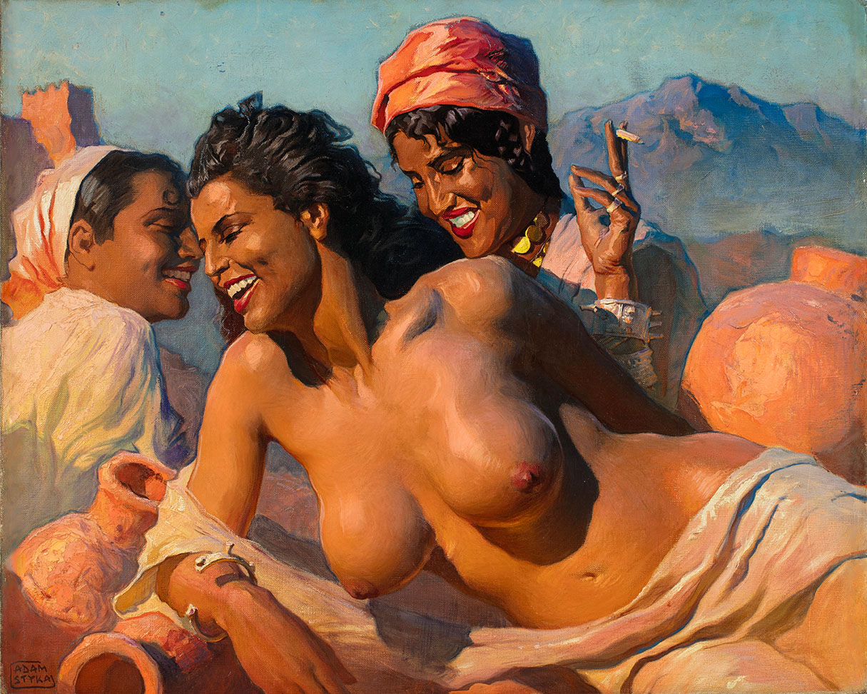 W 1911 roku Adam Styka zaprezentował swój pierwszy obraz na paryskim salonie, zatytułowany „Orientalista”. Jeszcze w tym samym roku wyjechał w podróż do Algieru i Tunisu, skąd przywiózł szereg szkiców do przyszłych kompozycji. W 1914 roku na paryskiej Wystawie Orientalistów pokazał już kilkanaście dzieł, które zyskały bardzo dobry odbiór i pochwałę prezydenta Francji Raymonda Poincaré. Gdy wybuchła wojna wstąpił jako ochotnik do armii polskiej, walcząc pod dowództwem generała Józefa Hallera. Wędrował po krajach północnej Afryki, opisując później swe wrażenia w niepublikowanych nigdzie w całości „Wspomnieniach z Afryki”: „Moja znajomość z Afryką sięga dość odległych lat, bo czasu I wojny światowej. Gdy po niedługim pobycie w oazach Sahary algierskiej, wystawiłem kilkanaście obrazów w Algierze [1916] na rue de l’Isly, gubernator generalny Algieru J. E. Lutaud tak się zainteresował moim światłem słonecznym (…), że nie tylko nabył jeden mój obraz, ale ponadto przyznał mi subwencję rządową (…). Była mi ona wielką pomocą i bodźcem do dalszej wytężonej pracy” – pisał Styka (fragment „Wspomnieć z Afryki” A. Styki, [w:] Czapliński Cz., dz. cyt., s. 137). Artysta bywał częstym gościem w pałacu gubernatora i został jego towarzyszem w urzędowej misji na terenie gór Auresu. Ponadto zwiedził Tanger, Marokko, Tunis i z karawaną przeszedł całą Saharę, aż do Timbouctou. Zatrzymując się w różnych hotelach, rozkładał sztalugę na tarasach i w gorących promieniach słońca malował zaobserwowane sceny: palaczy haszyszu o zamglonych oczach, roześmiane tancerki, modlących się Arabów czy obładowane towarami karawany.
