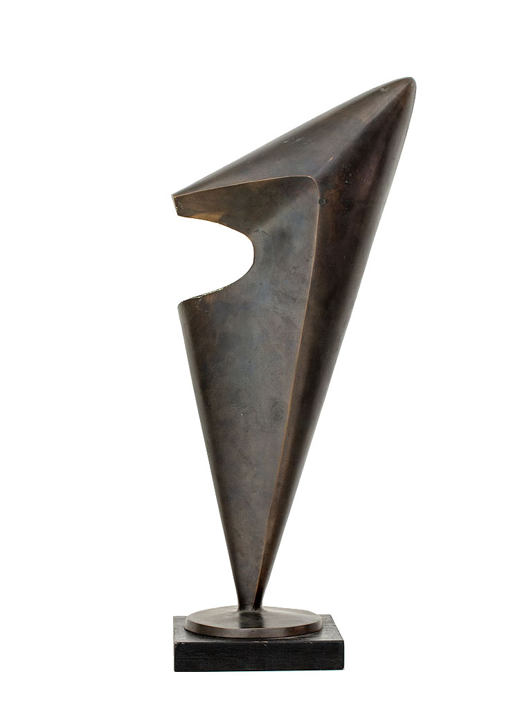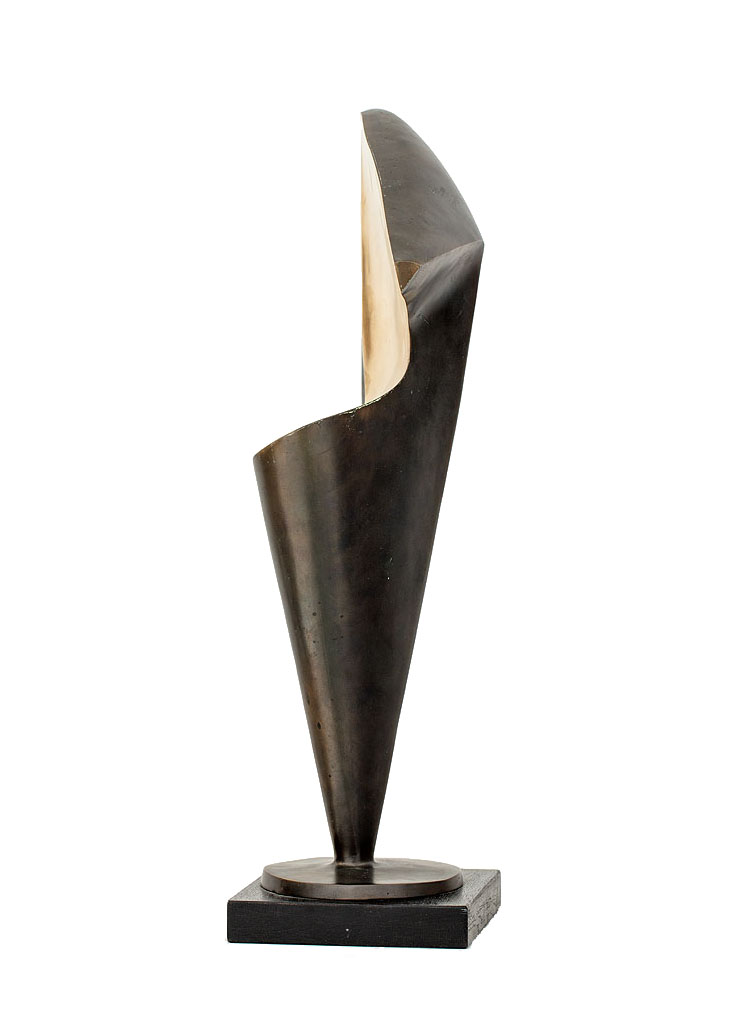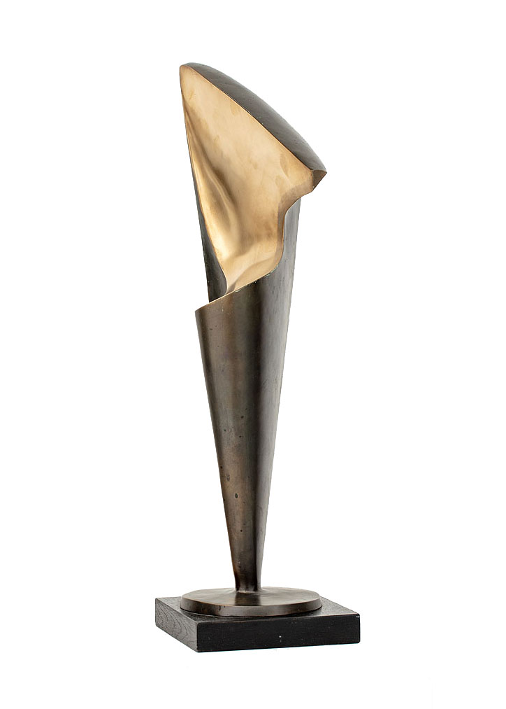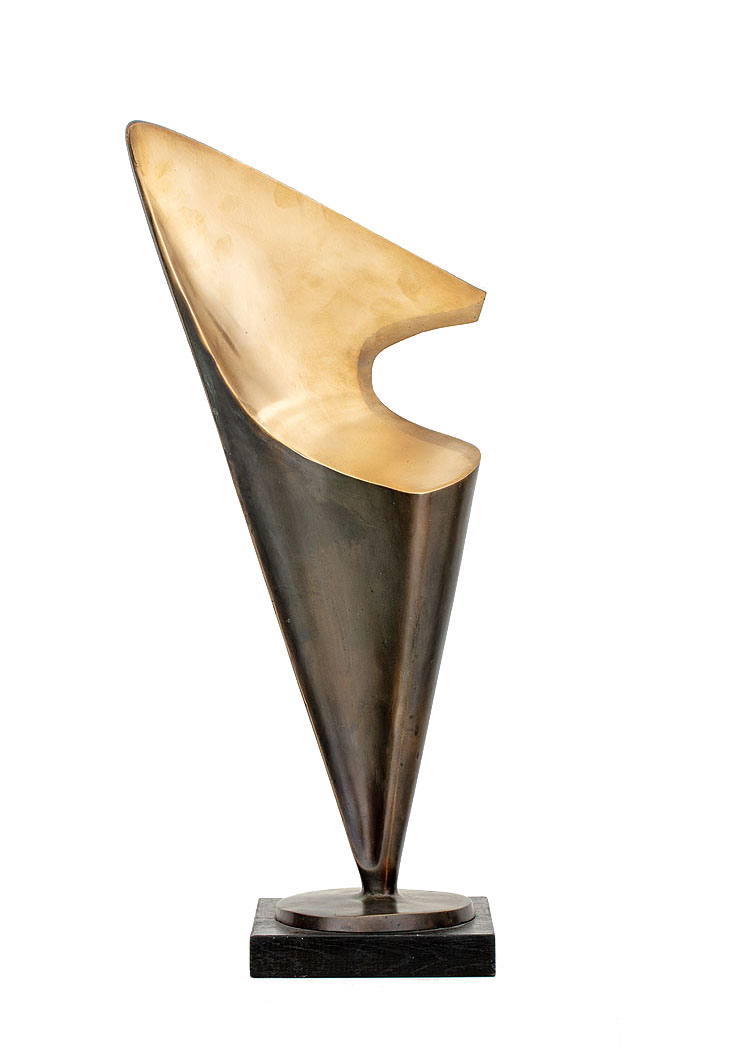 Zainspirowany naturą Tadeusz Łodziana od początku swojej drogi artystycznej traktował figurę kobiecą jako punkt wyjścia do formalnych poszukiwań. Choć temat ten miał długą i akademicką tradycję, artysta – korzystając z dorobku zachodniej awangardy – podjął próbę dotarcia do jego istoty. Upraszczając formę, eliminując detal i narrację, sprowadzał ciało do znaku – pełnego harmonii, syntezy i rytmu. Jak pisał Wojciech Skrodzki: „Łodziana jako jedyny właściwie twórca we współczesnej rzeźbie polskiej sięgnął do doświadczeń przede wszystkim Brâncușiego, a także Arpa. Najdoskonalsze realizacje rzeźbiarskie, tworzone w duchu maksymalnego dążenia do syntezy i prostoty kształtu, zaczęły powstawać pod koniec lat 50. Poczynając od tego okresu, rzeźby Łodziany były biologiczne i organiczne, ale w sensie bardzo daleko ku abstrakcji posuniętej interpretacji kształtu ludzkiego ciała” (Skrodzki W., Synteza formy, „Projekt”, t. 26, nr 5, 1981, s. 60-61). Motyw kobiecego aktu stanowił główny filar twórczości Łodziany – powracał w licznych wariantach, za każdym razem interpretowany na nowo. Charakterystyczne dla jego stylu syntetyczne bryły, zachowują elegancję i naturalny rytm, a jednocześnie odznaczają się nowoczesną śmiałością formalną. Prezentowana rzeźba „Trójkątna” wyróżnia się na tle dorobku artysty jako najbardziej zgeometryzowana, niemal całkowicie abstrakcyjna wizja kobiecej figury. Łodziana sprowadza tu ciało do lapidarnego znaku, do idei, która w subtelnej grze kształtów i światła nabiera symbolicznego wymiaru. „Trójkątna” została odlana w brązie przez artystę za jego życia, w pojedynczym egzemplarzu, co czyni ją dziełem unikatowym i kolekcjonersko wyjątkowym. Smukła, strzelista, zbudowana z wyważonych proporcji, rzeźba zachowuje organiczny puls mimo całkowitej geometryzacji. Gładka, polerowana powierzchnia kontrastuje z patynowanymi partiami metalu, podkreślając napięcie między formą a światłem. Łodziana osiąga tu rzadką w rzeźbie równowagę między awangardową syntezą a klasycznym poczuciem piękna – tworząc czystą i poetycką opowieść o kobiecości.
