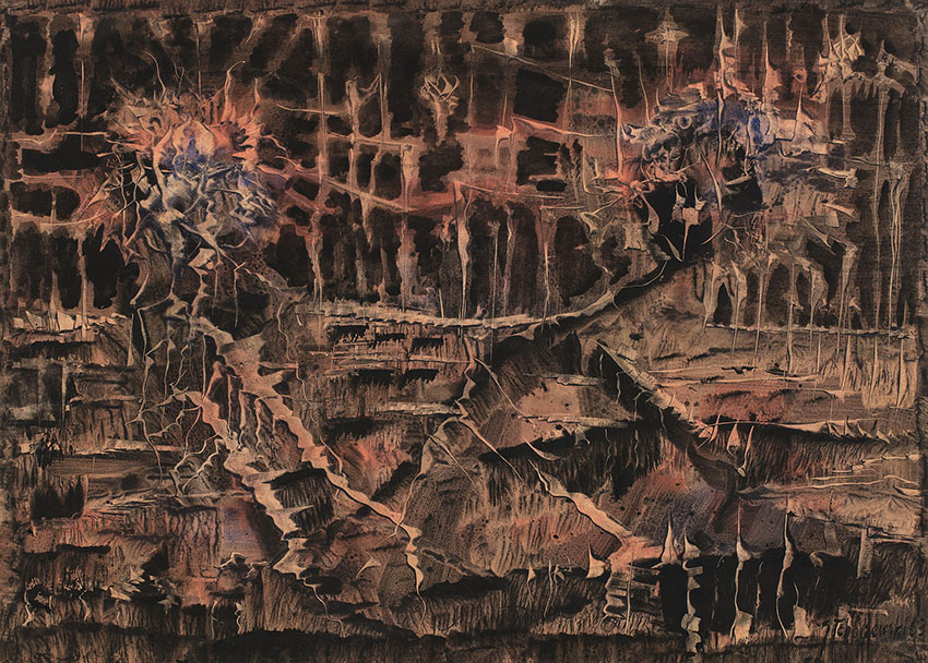 Sądzę, że rolą malarza jest wywoływać życie, przemieniać bierną materię plastyczną w pulsujący życiem organizm. – Jerzy Tchórzewski (Jerzy Tchórzewski. Malarstwo [katalog wystawy], wyd. ZPAP – CBWA „Zachęta”, Warszawa 1969, s. nlb) Jerzy Tchórzewski urodził się w 1928 roku. W czasie okupacji był żołnierzem Armii Krajowej. Po wojnie, w latach 1946-1951, studiował malarstwo na Akademii Sztuk Pięknych w Krakowie. W 1948 roku jako jeden z najmłodszych twórców brał udział w krakowskiej Wystawie Sztuki Nowoczesnej, wydarzeniu, które określiło kształt i charakter formacji nazywanej drugą awangardą w malarstwie polskim. Już w czasie studiów związał się ze środowiskiem późniejszej Grupy Krakowskiej, której stał się współzałożycielem w 1957 roku. Od 1959 roku należał do międzynarodowego ruchu Phases, który zrzeszał artystów tworzących w duchu surrealizmu. Po studiach przeniósł się w 1954 roku do Warszawy, gdzie objął pracownię malarstwa na Wydziale Grafiki ASP. Tchórzewski był twórcą wyjątkowym i osobnym – zupełnie odrzucił postulaty obu dominujących po wojnie kierunków: realizmu socjalistycznego i koloryzmu, zwracając się w kierunku malarstwa surrealistycznego i nadrealistycznego. Już od najwcześniejszego figuratywnego okresu twórczości, który przypadł na lata 1948-1955, jego prace miały charakter zbliżony do surrealizmu. Po 1955 roku płótna zdominowały wizje kosmicznych kataklizmów, wulkanicznych erupcji, rozbłyskujących i niknących gwiazd. Z mroku wydobywały się zygzakowate linie błyskawic, spływająca lawa i elektryczne wyładowania. W latach 60. w niektórych kompozycjach pojawiała się postać ludzka przypominająca mitologicznego tytana lub wręcz Prometeusza. Od lat 70. artysta równie chętnie sięgał po tematykę religijną. Treści te zdominowały jego twórczość w latach 80., kiedy związał się z niezależnym ruchem artystycznym działającym w opozycji do reżimu. Jerzy Tchórzewski był artystą cenionym za życia. O jego geniuszu malarskim pisał Tadeusz Różewicz, wspólnie z Tchórzewskim swoje prace pokazywała Alina Szapocznikow. Po sukcesie na Ogólnopolskiej Wystawie Młodej Plastyki w Warszawie (1955) przyszły kolejne kamienie milowe – dwukrotne zaproszenie do udziału w 5. Biennale Sztuki w Sao Paolo (1959 i 1965), 2. Biennale Młodych w Paryżu (1961) i 34. Biennale Sztuki w Wenecji (1968) oraz udział w głośnej wystawie 15 Polish Painters w Museum of Modern Art w Nowym Jorku (1961). Do najważniejszych wystaw w Polsce zaliczyć należy, oprócz wspomnianych wcześniej, dwa pokazy w Zachęcie: w 1957 roku wspólnie z Szapocznikow oraz indywidualną wystawę w 1969 roku. W 1980 roku odbyła się wielka wystawa w Muzeum Narodowym we Wrocławiu. Tchórzewski brał udział w licznych wystawach zbiorowych, w kraju i zagranicą. Jego prace mają w swoich zbiorach największe kolekcje prywatne i instytucjonalne, m.in. Muzeum Narodowe w Warszawie, Krakowie, Poznaniu, Kielcach, Gdańsku, Szczecinie Wrocławiu, Muzeum Sztuki w Łodzi, Gallerie Lambert w Paryżu, Museum Folkwang w Essen, Musee des Beaux-Arts w Liege, Musee Cantonal des Beaux-Arts w Lozannie, Galeria Narodowa w Pradze, Fundacja Guibentiana w Lizbonie oraz Muzeum w Rochester.