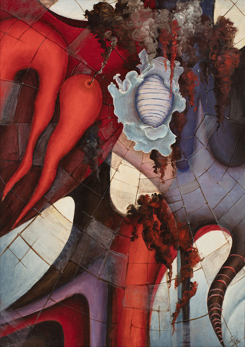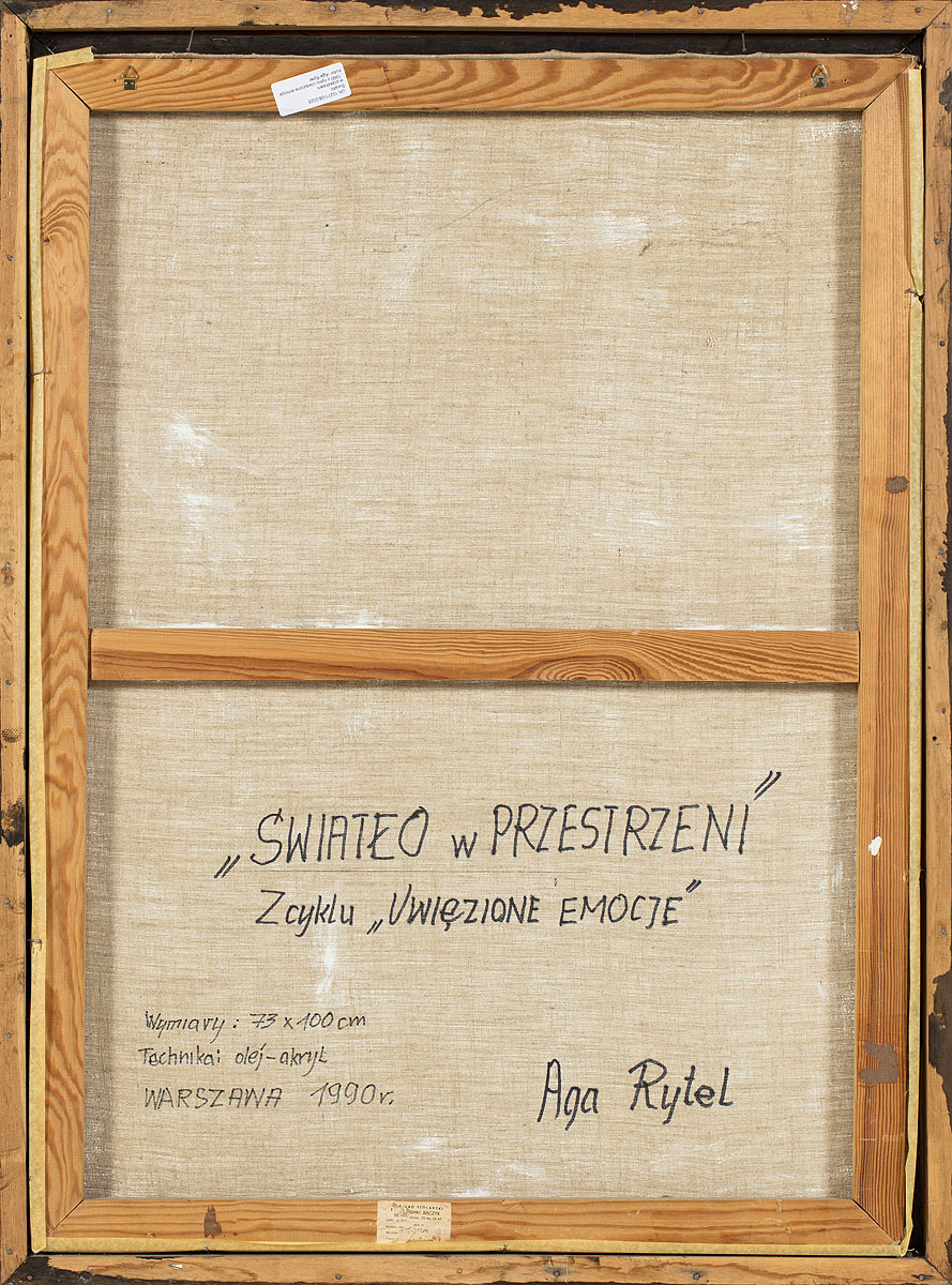 sygn. p.d.: Rytel, sygn. i opisany na odwrociu: "ŚWIATŁO w PRZESTRZENI" / Z cyklu "UWIĘZIONE EMOCJE" / Wymiary: 73 x 100 cm / Technika: olej-akryl / WARSZAWA 1990 r./ Aga Rytel