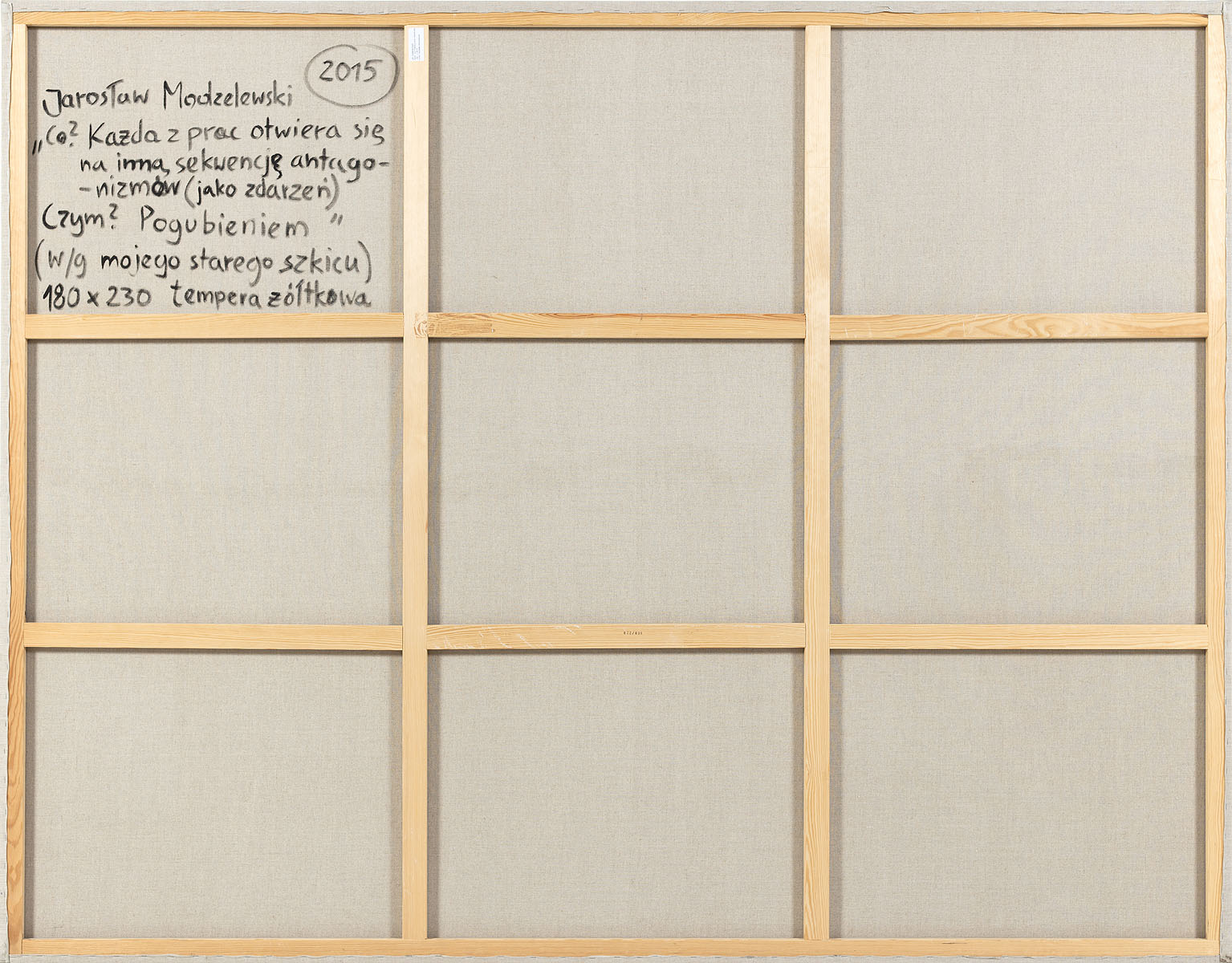 sygn. i opisany na odwrociu: 2015 / Jarosław Modzelewski / "Co? Każda z prac otwiera się na inną sekwencję antago- / -nizmów (jako zdarzeń) / Czym? Pogubieniem" / (wg mojego starego szkicu/ ) 180 x 230 tempera żółtkowa