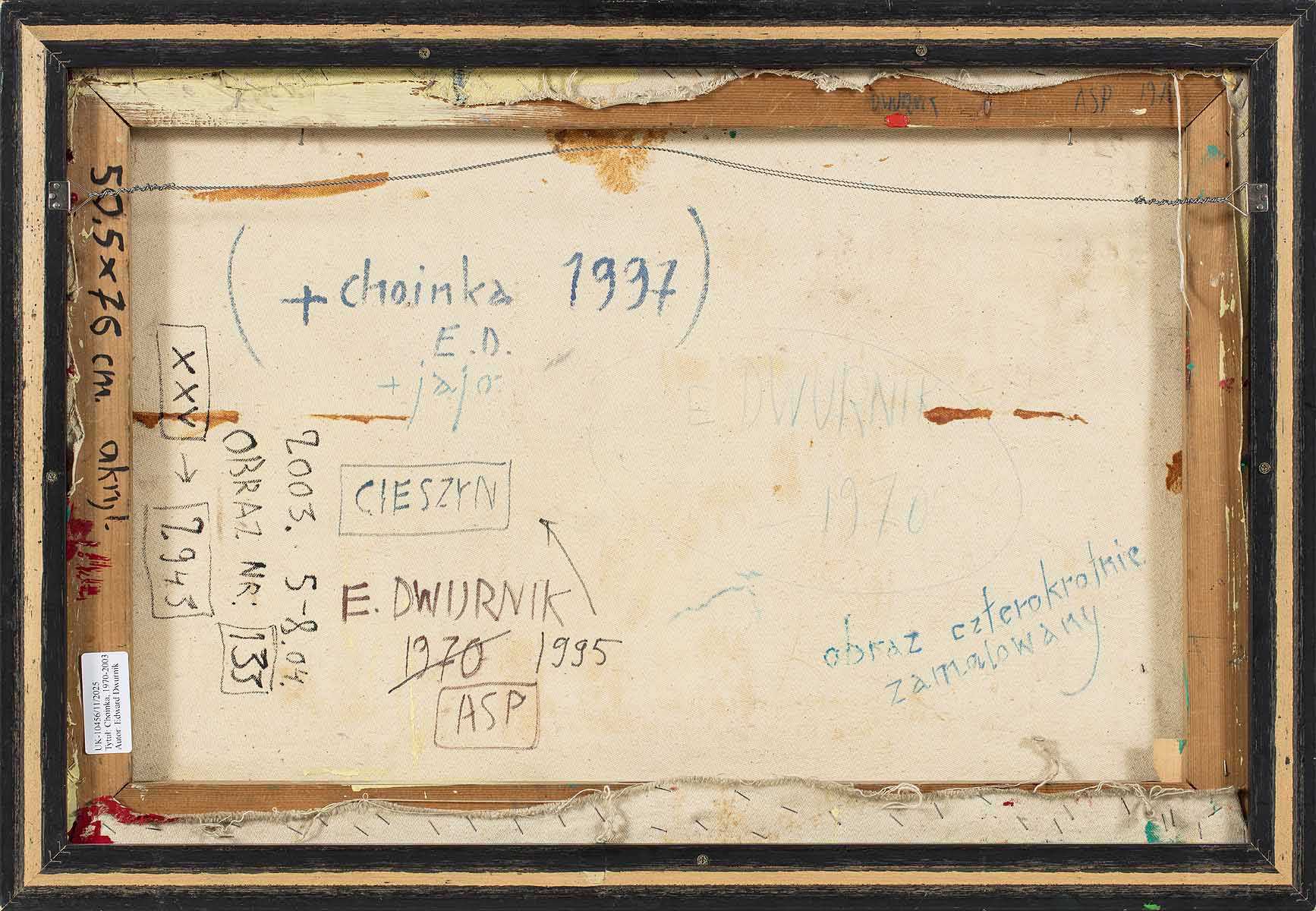 sygn. i opisany na odwrociu: (+choinka 1997) / E. D. / +jajo oraz E. DWURNIK / 1970 oraz CIESZYN / E. DWURNIK / 1970 [przekreślone] 1995 / ASP oraz 2003. 5-8.04 / OBRAZ NR 133 / xxv 2943 oraz informacja autorska: obraz czterokrotnie zamalowany
