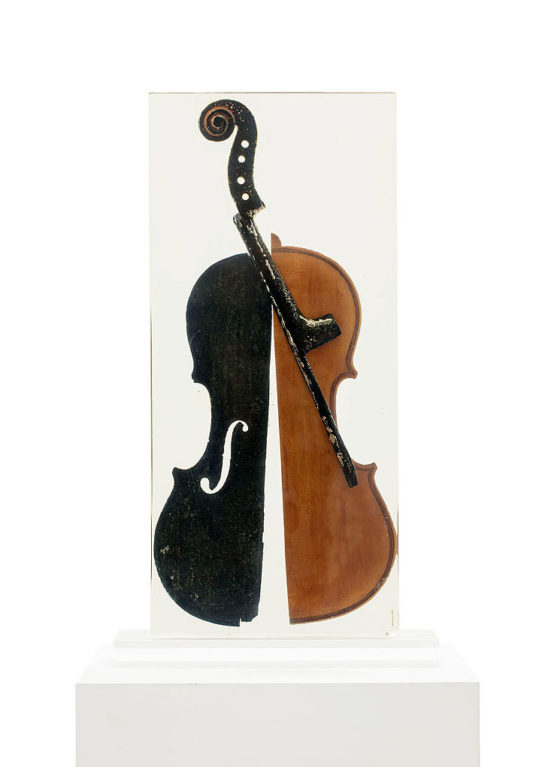 skrzypce drewniane, żywica, podstawa z pleksi / 51,5 x 40 x 24 cm, ed. 58/100