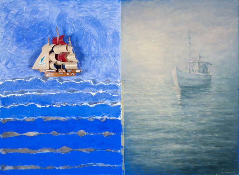 pigment, klej, akryl, żywica, pamiątka z nad morza (statek) na płycie pilśniowej / 140,5 x 103,5 cm